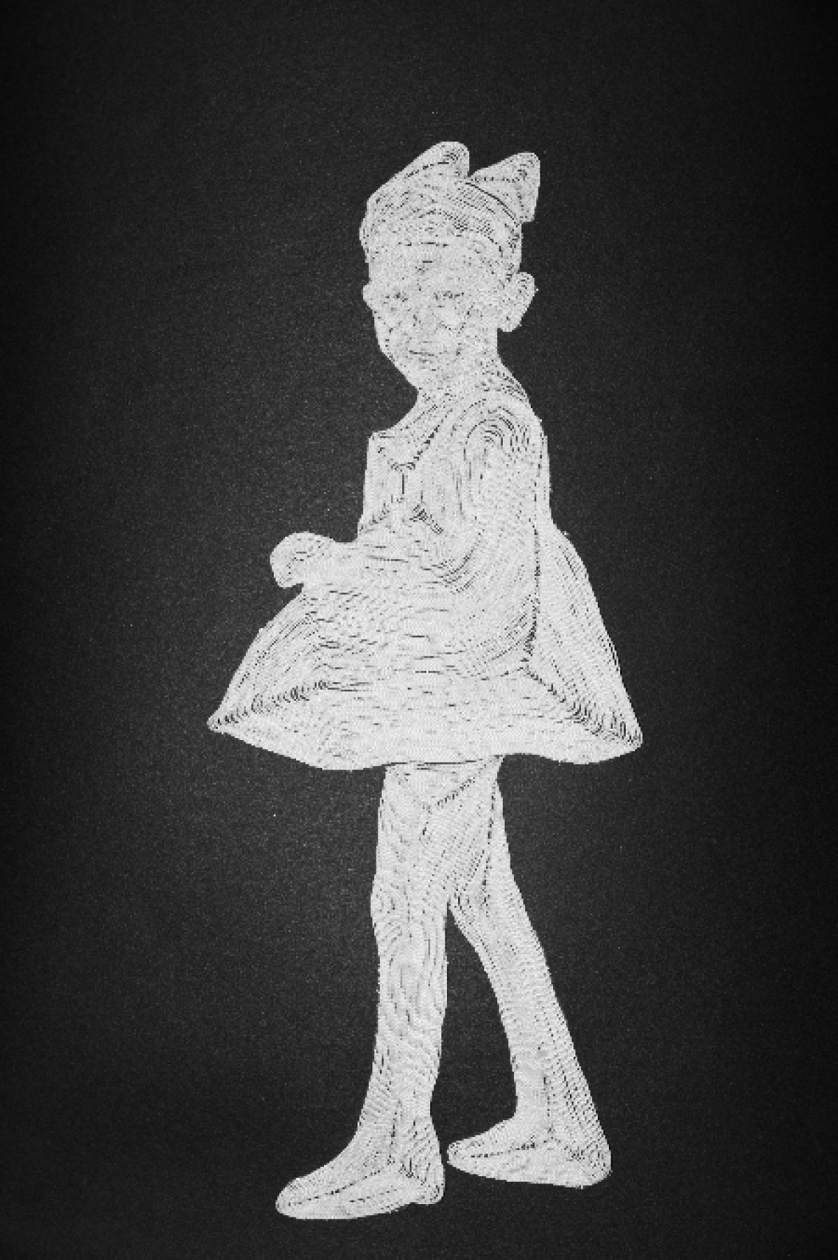 Ebben a fotósorozatban családi fotókat hasznosítok újra úgy, hogy a képen szereplő portrét hímzőfonallal ragasztom körbe a kontúrok mentén, majd azokat körkörösen feltöltve. Végül a feldolgozás, elengedés aktusaként leemelem, transzferálom a fotóról a kész textiltportrét.