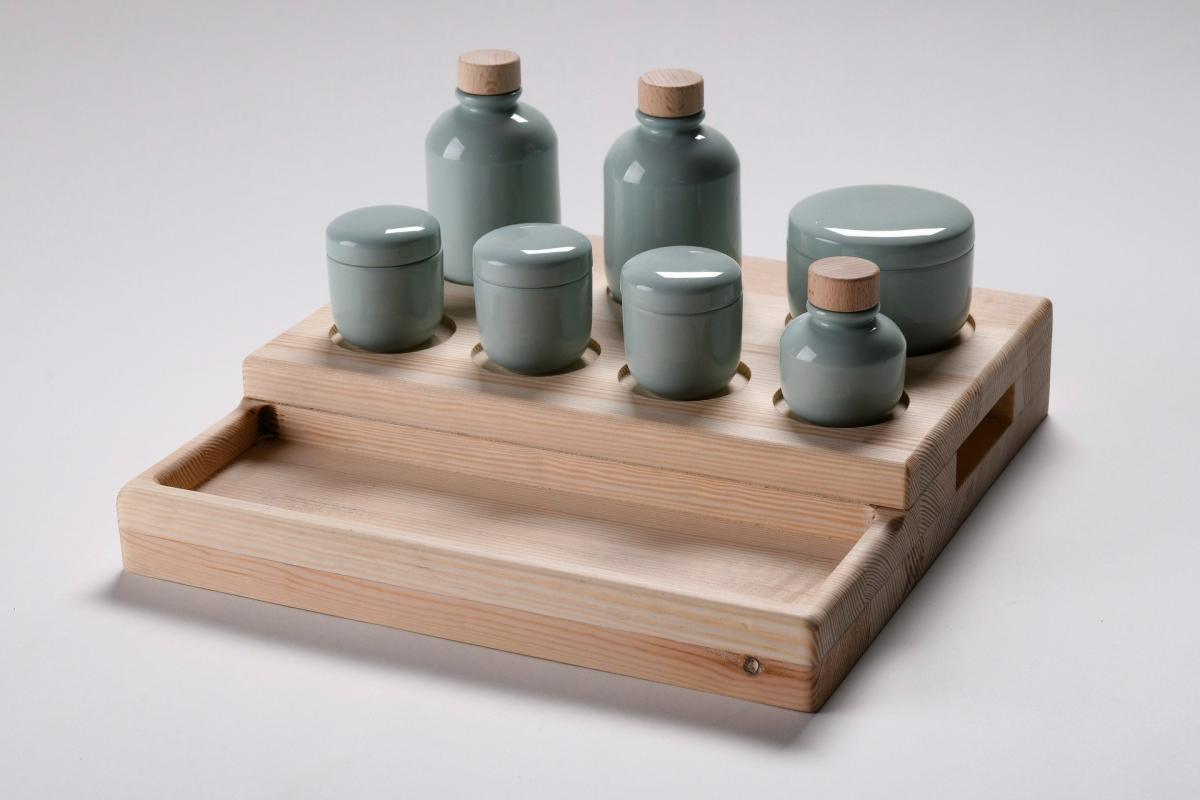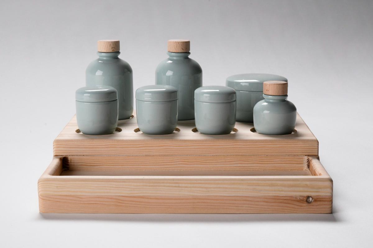 Az alapképzésen készült diplomamunkám egy házi porcelán tároló készlet, mely a legalapvetőbb szépítkezési termékek tárolásának ad lehetőséget. A készletet az Alföldi porcelángyárban volt lehetőségem kivitelezni. Fotók: Rajnai Richárd