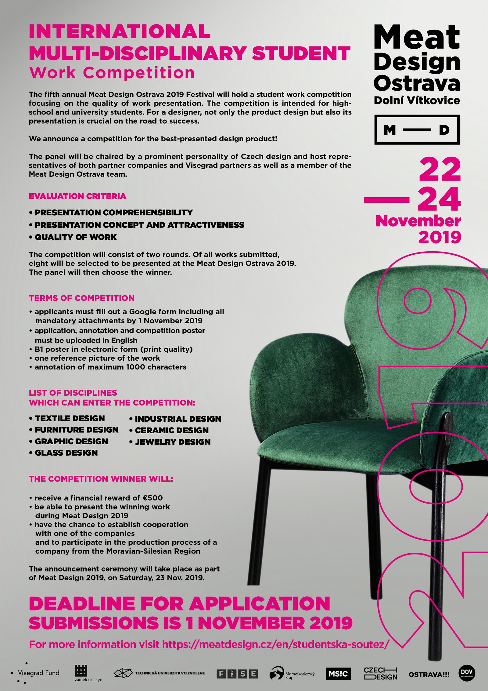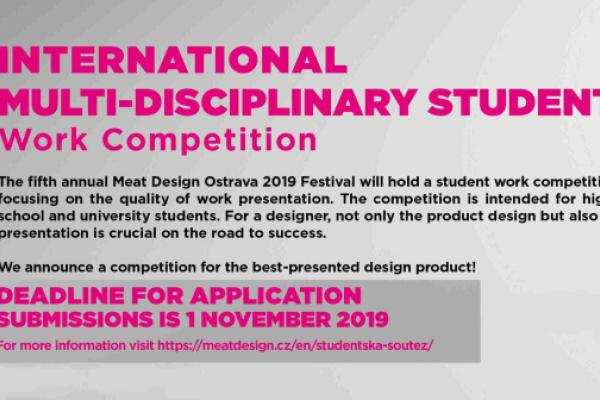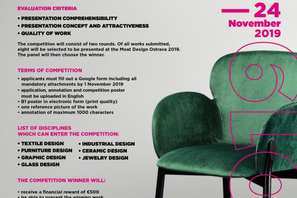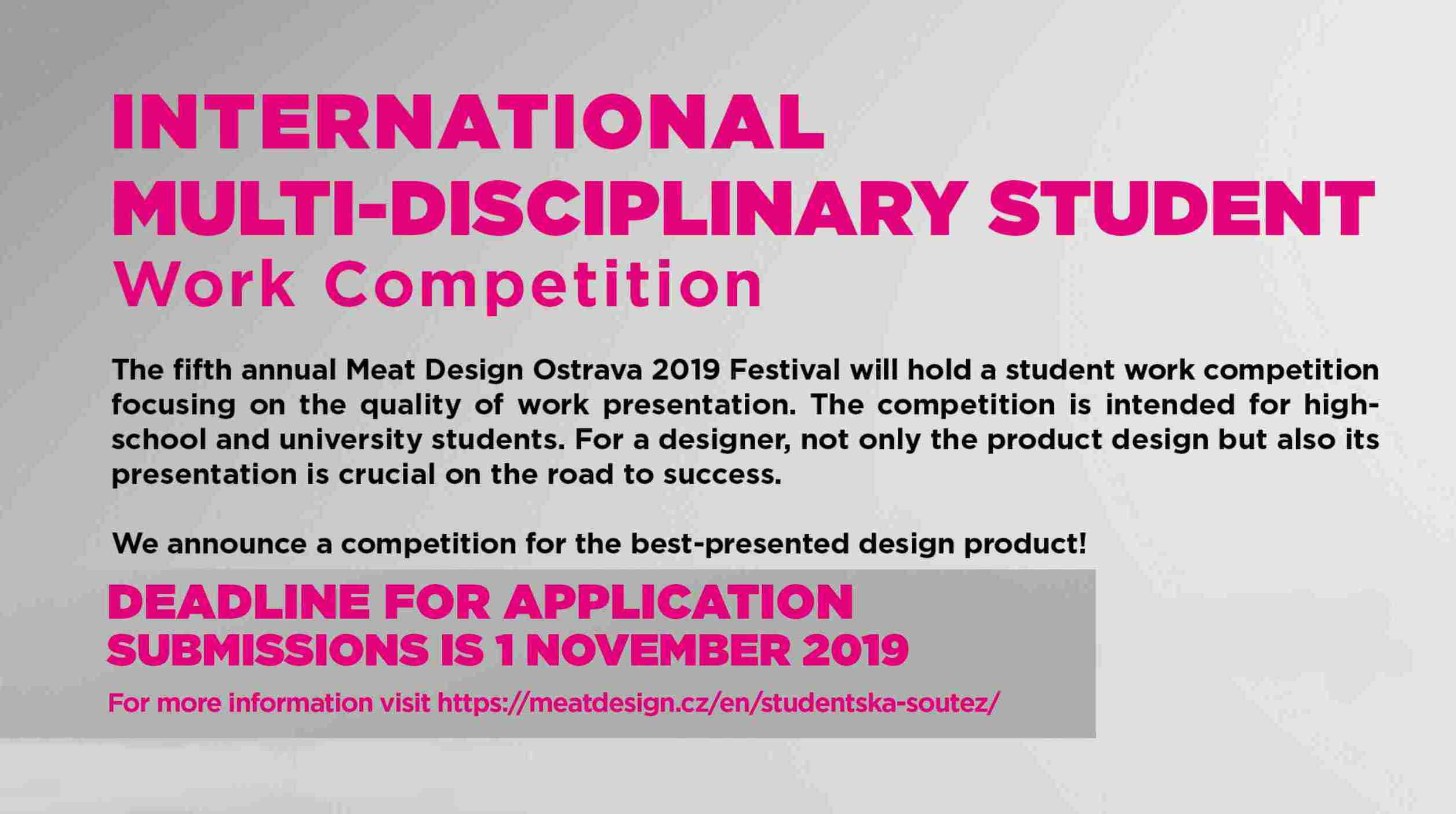 The fifth annual 2019 Meat Design Festival in Ostrava will introduce a multi-disciplinary student work competition focusing on the quality of work presentation. Students from different schools, disciplines and age-groups will present their school projects. They will pit their strength against each other in the ability to convey the idea of their work in a limited format. We want the competition to raise awareness of the fact that not only the product design but also its presentation is crucial on the road to success.