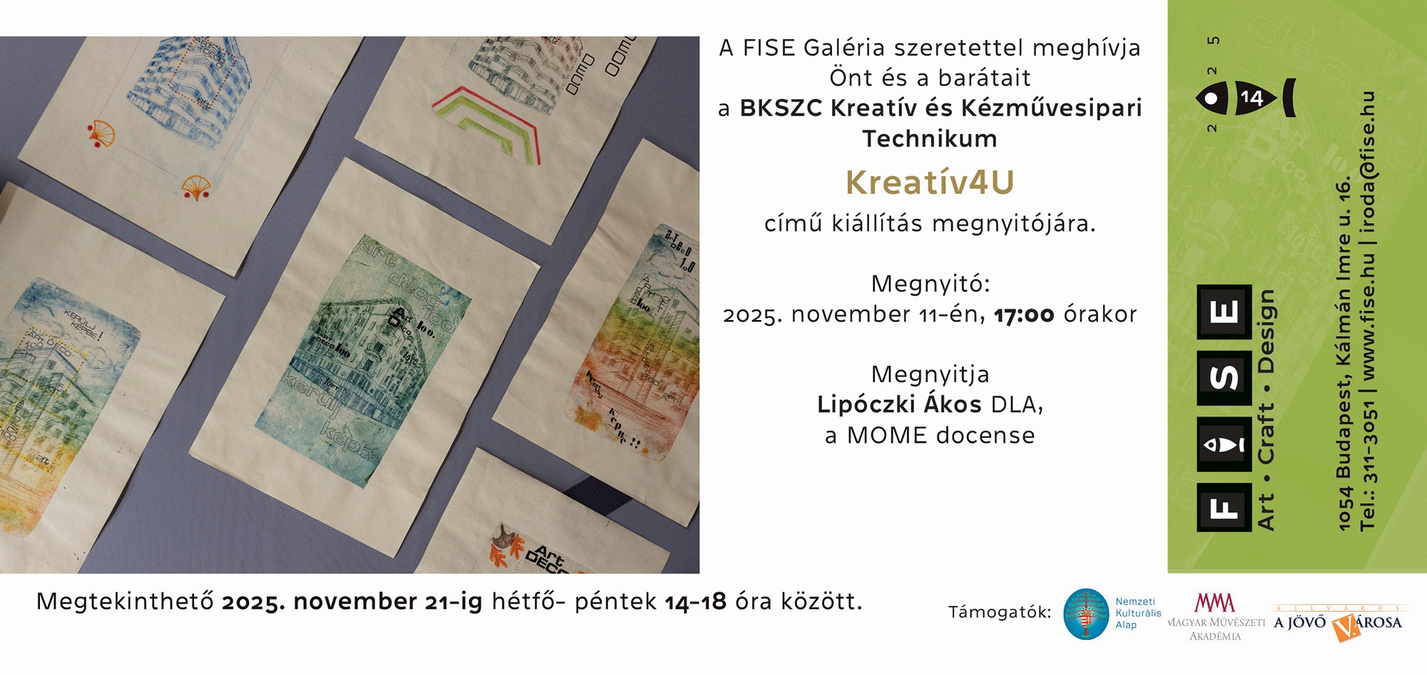 I. helyezést elért Stamp Deco csapatunk – a Budapesti Komplex Szakképzési Centrum (BKSZC) Kreatív és Kézművesipari Technikum képviseletében – bemutatkozási lehetőséget kapott a neves FISE Galériában. A kiállításon nemcsak a díjnyertes pályamunka lesz látható, hanem iskolánk további 6 díjazott csapatának alkotásai is helyet kapnak.