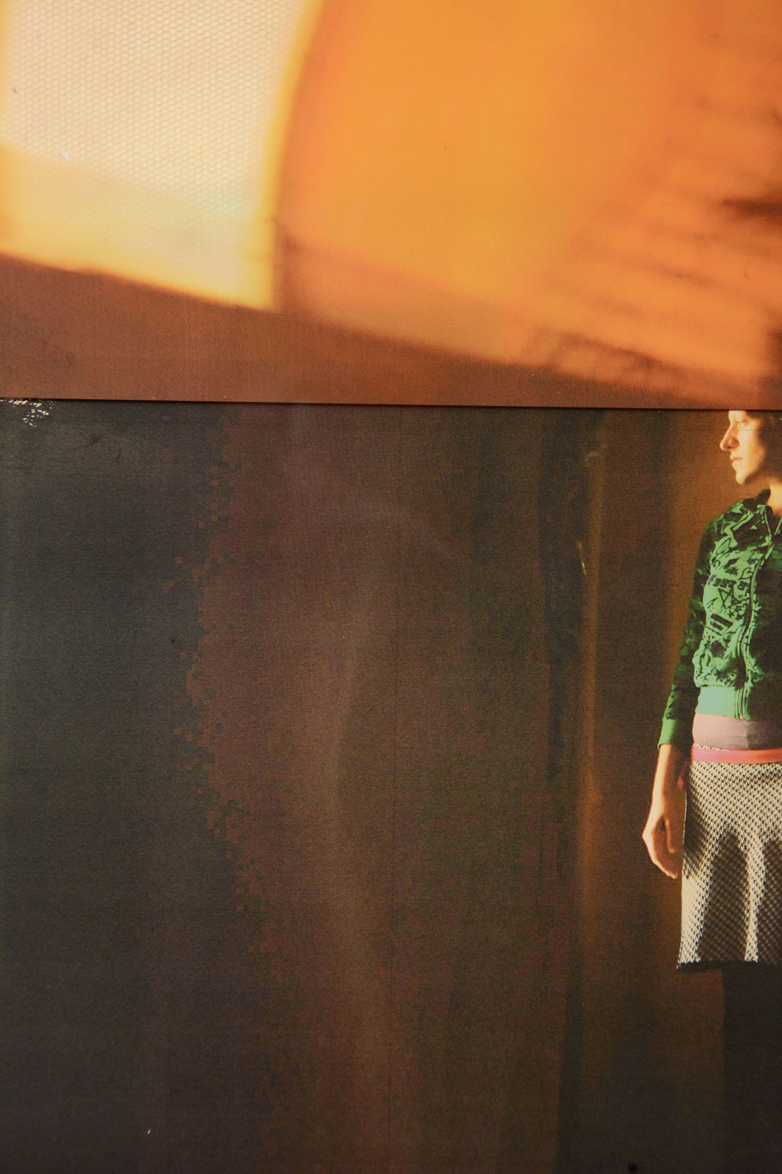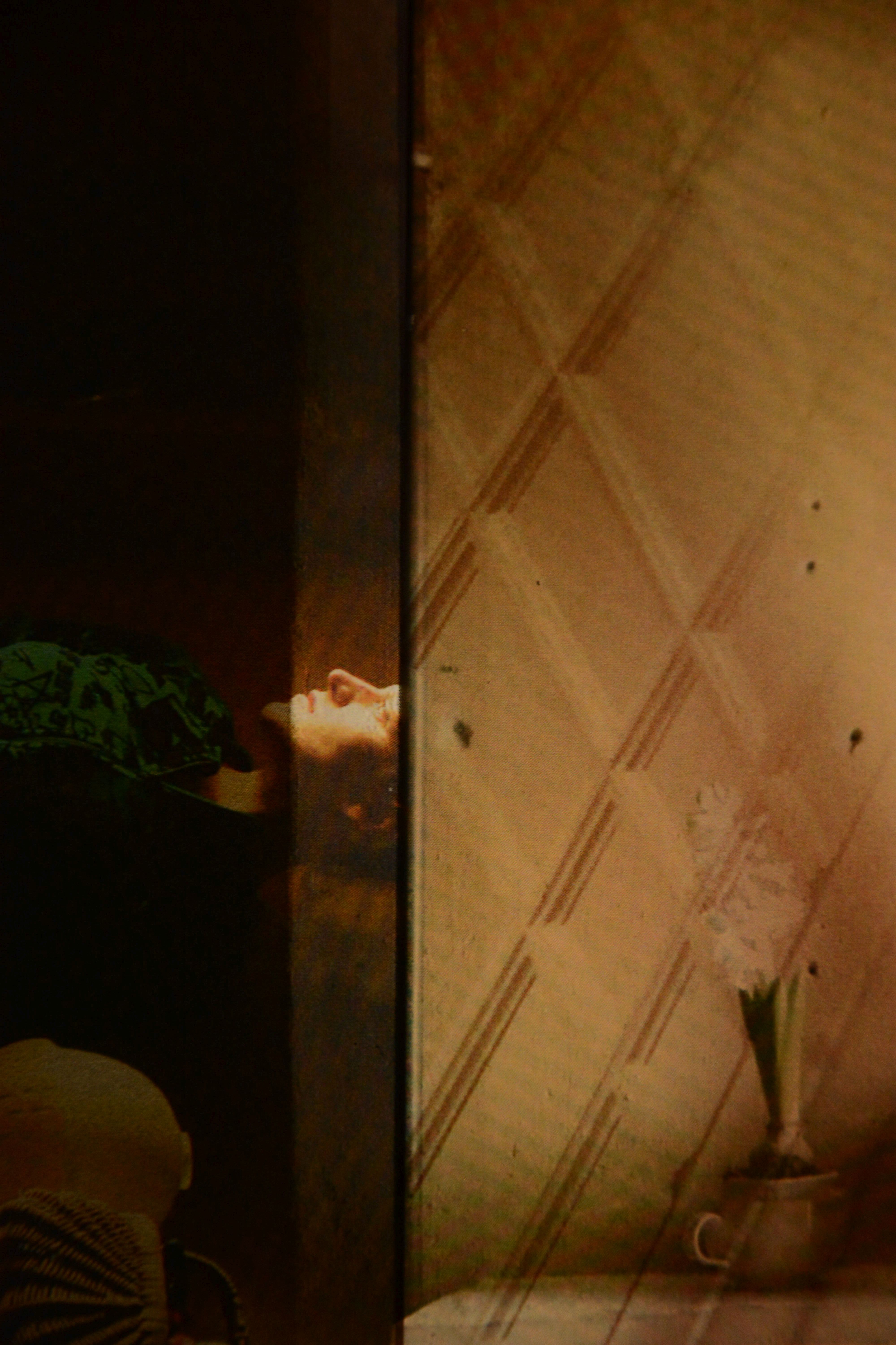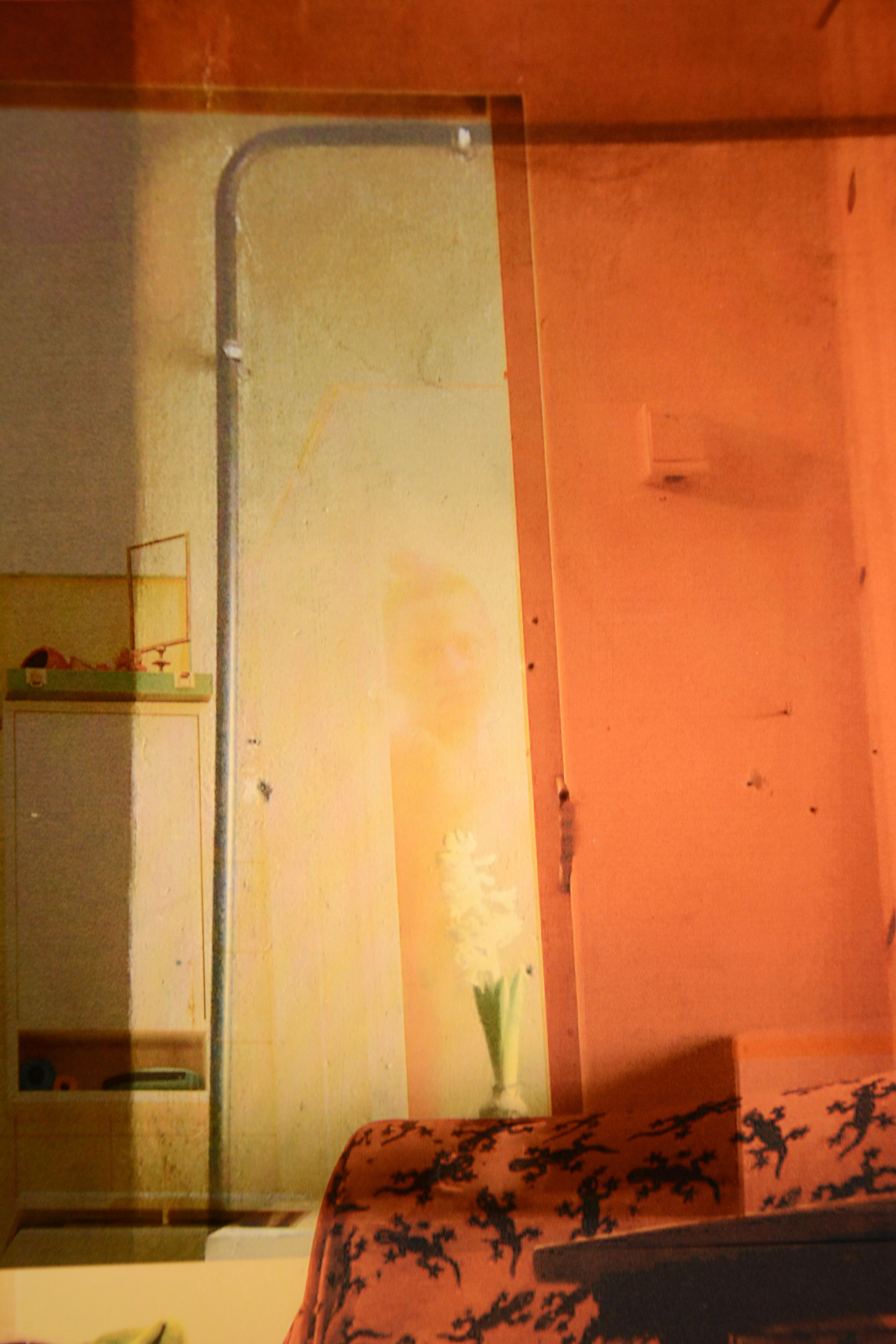 Apró albérletemből indult el közös történetünk a képekkel. Otthonom minden zegzuga egy-egy kép története. A házunk legtetején egy gangos teraszon és egy padlástéren keresztül jutok el a belső térig. Olyan ez az út, mint egy kép útja. Ez a három helyszín a munkapadom. Ezen három színtérről készült fotókat nyomtattam fóliára és helyeztem egymásra olyan sorrendben, mint ahogy hazaérkezem. Előtér-középtér-háttér.