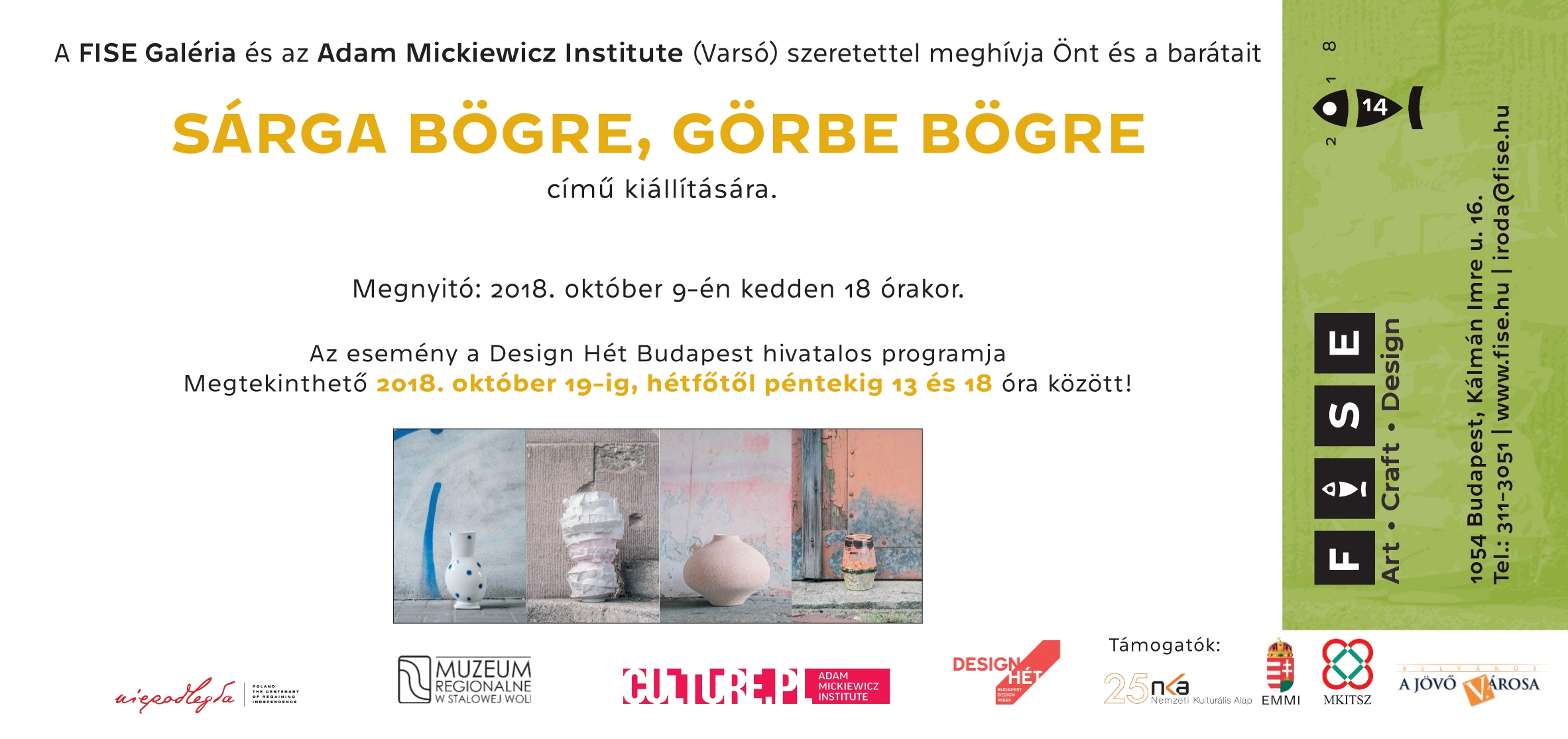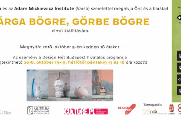 A Budapest Design Week során bemutatott kiállítás címe egy nyelvtörő: Sárga bögre, görbe bögre. A kiállítás kurátora, Agnieszka Jacobson-Cielecka arra a kérdésre keresi a választ, hogy vajon kiemelhető-e egy, a régió országaira jellemző szín, melyet a cseh, szlovák, magyar vagy lengyel tervezők előszeretettel választanak projektjeikben? A kiállítás kísérletet tesz Lengyelország és a szomszédos országok színbeli identitásának megállapítására. A kiállításon a cseh, lengyel, szlovák és magyar tervezők által hasonló tárgyakhoz választott színeket elemzik: vázák és textíliák színeit vizsgálják. Az összegyűjtött tárgyak alapján olyan színösszetételek keletkeznek - rózsaszín és égszínkék, zöld és sárga -, melyek Csehországból, Szlovákiából, Magyarországról és Lengyelországból származó projekteken tűnnek fel.