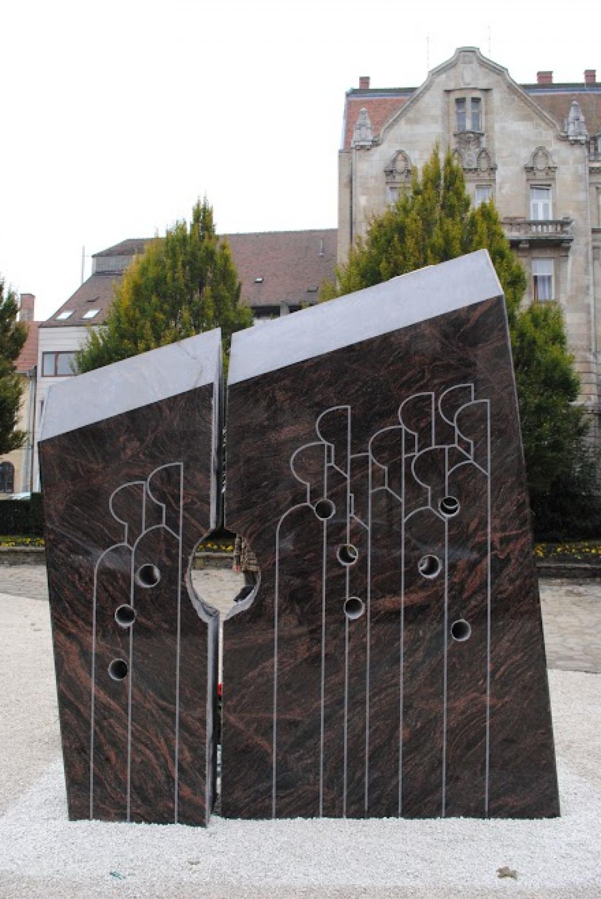 Az 56-os események mementója, mely utal a védtelen tömegbe lövetésekre, a forradalom lendületére, zászlajára, az ország szellemi kettéhasadására, de egyben a remény sugarára is. A természetes fény, ill. az esti megvilágítás fokozza a drámaiságot. 3m magas, 2,5m széles 40 cm vastag indiai gránit, lőtt lyukakkal.