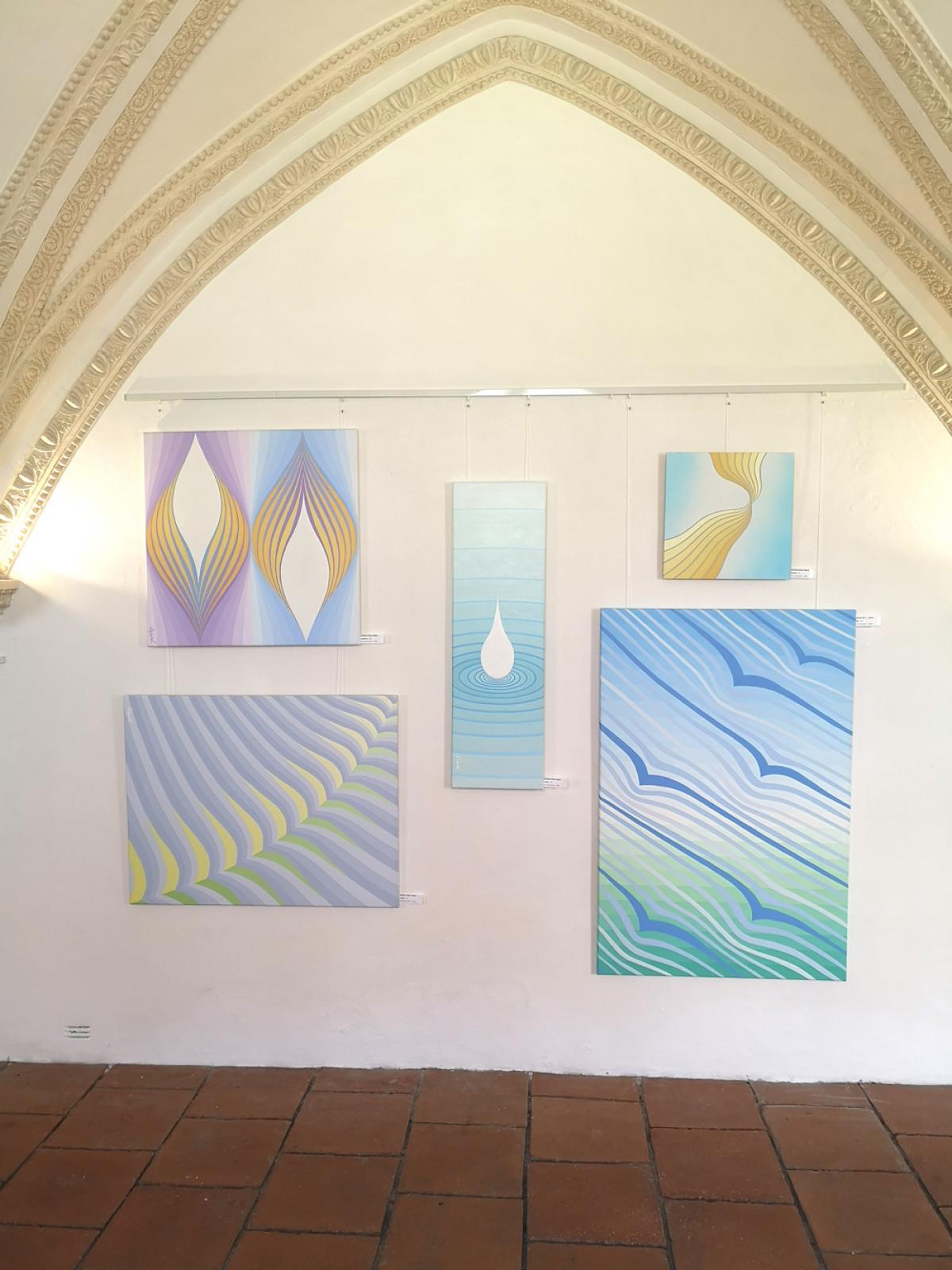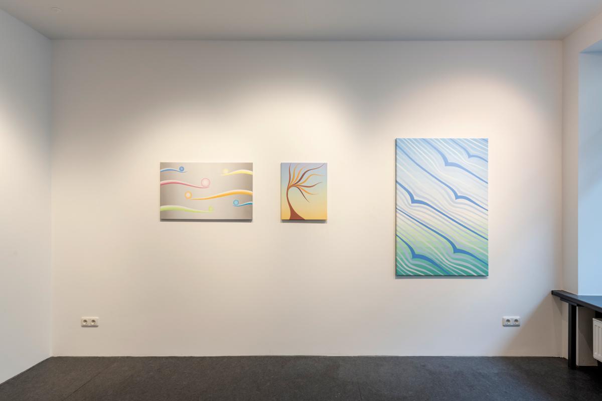 Az elrepülő madarak inspiráltak ennek a képnek az elkészítéséhez. Az, ahogyan elszárnyalják koreográfiáikat a levegőben, és ahogyan elrepülnek egymás mellett, egymás mögött, együtt. Mindig kellő távolságot tartanak, hogy ne akadályozzák egymást. Ez mindig nagyon fenomenális nekem, ez olyan dolog, amitöl le vagyok nyűgözve. A második kép 2021 ben készült, Konstruktiv versus expresszív kiállításon, Gedok Galeria München. Harmadik kép 2020-ból, Kreuzgang Benediktbeuren, Kiállitás címe: Frau, Natur, Kunst.