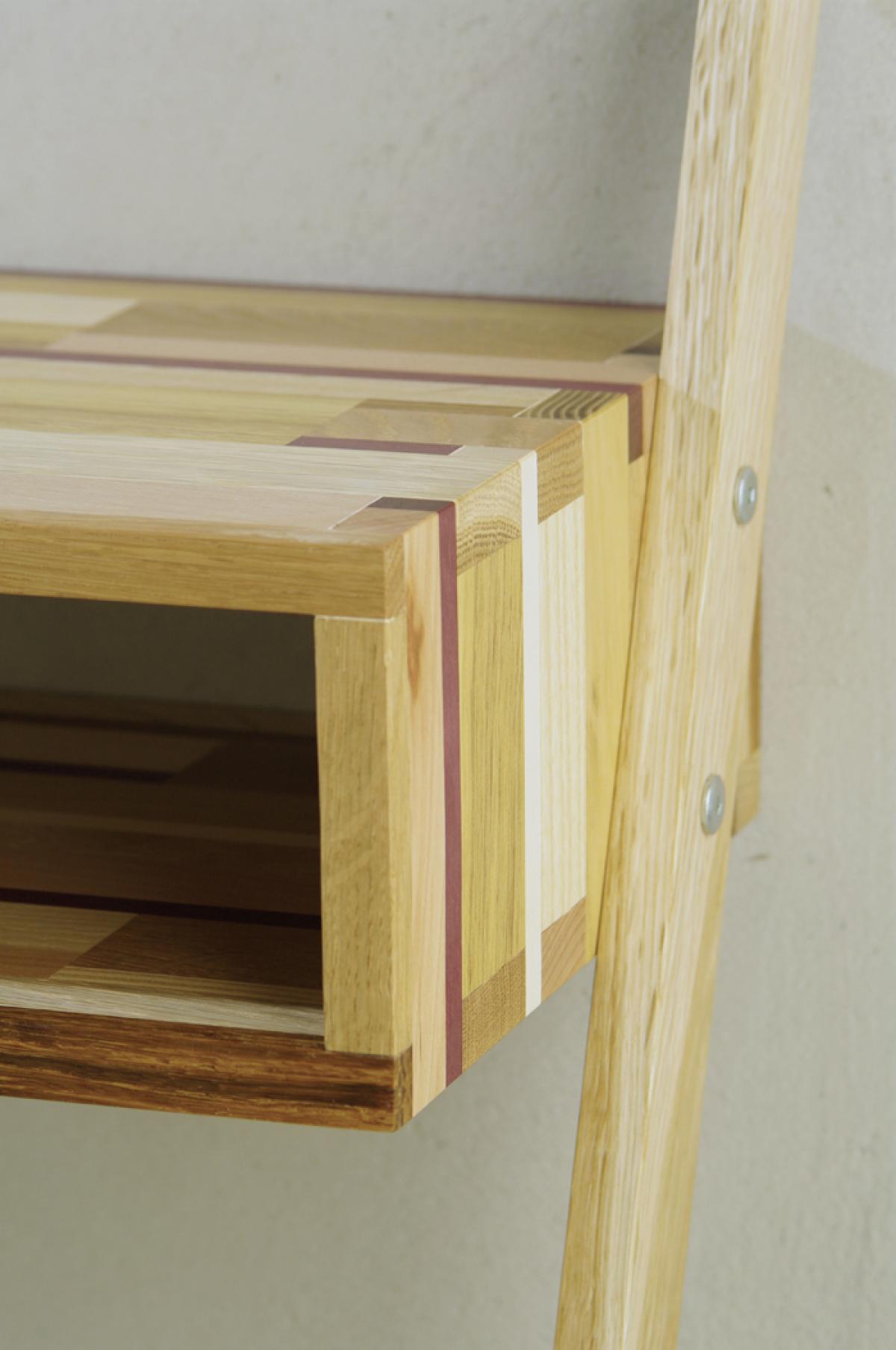 A karakteres textúrát ellensúlyozandó egy egyszerű, mégis izgalmas formát kerestem - ezért támaszkodik a falnak ez a kétlábú éjjeliszekrény.