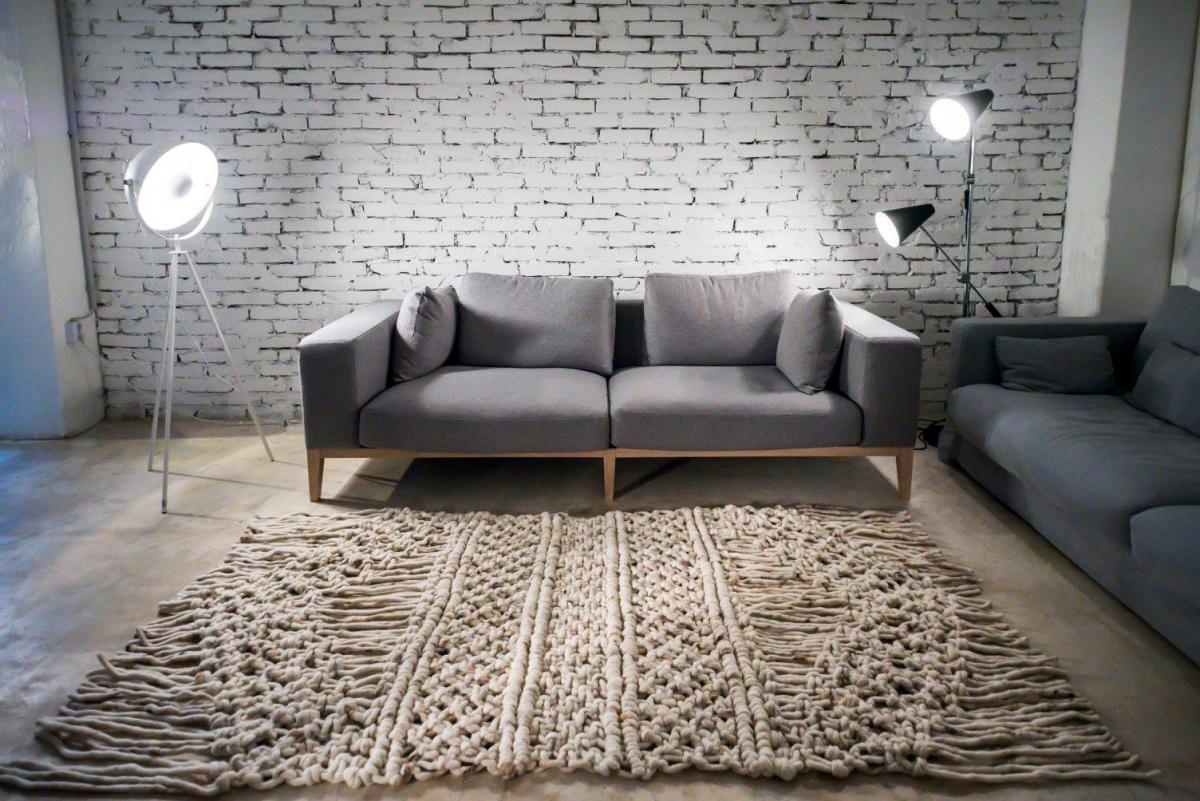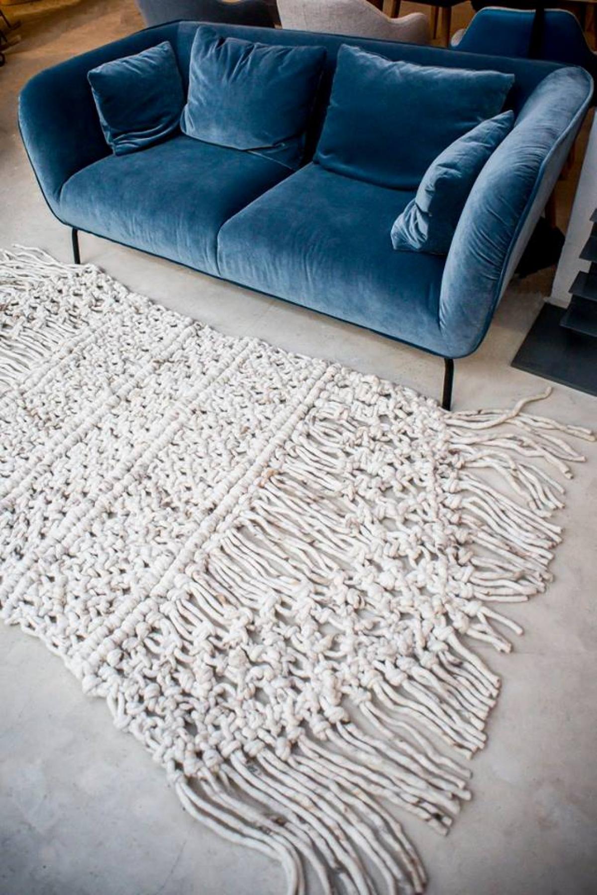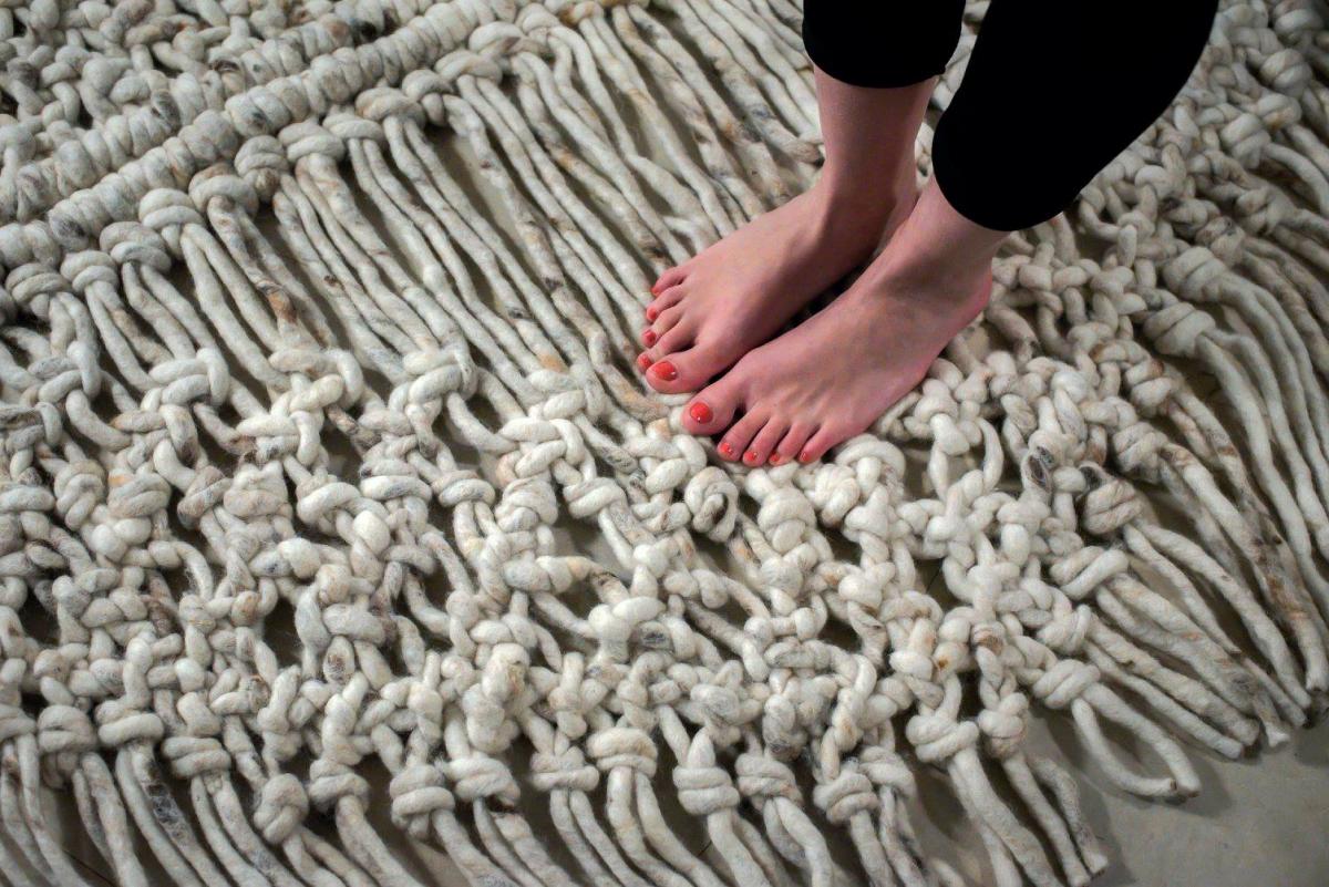 Vezetőszálas gyapjú alapanyagot használtam a szőnyegként funkcionáló padló objekthez, melynek csomói lépésnél stimulálják a lábak reflex területeit.