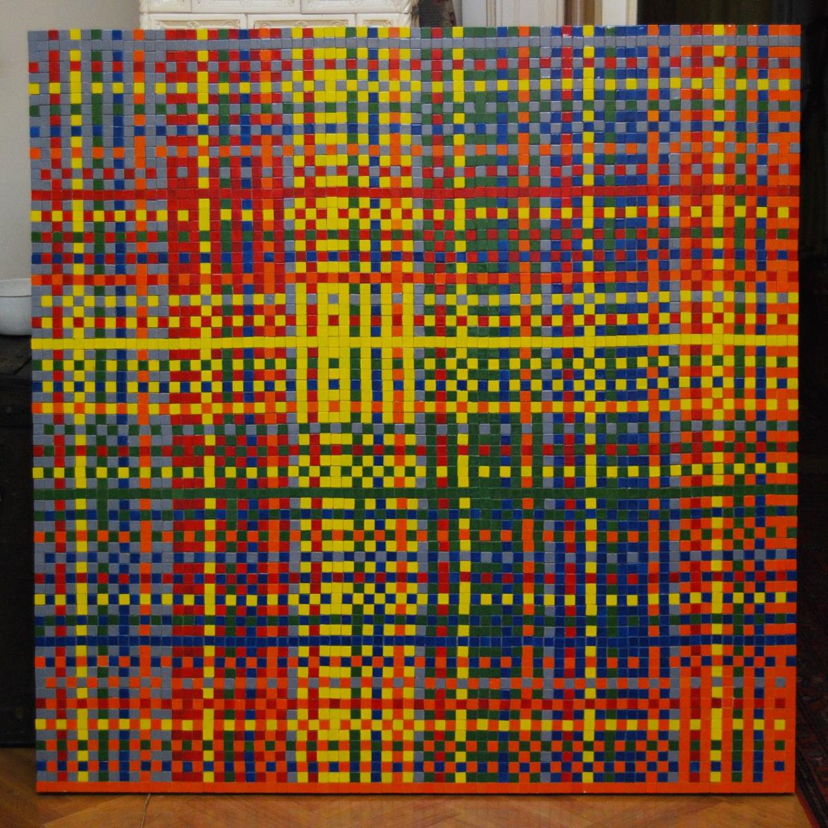 Mérete 150 x 150 cm. Rubik Ernő bűvös kockáját eredetileg szemléltető eszközként fejlesztette ki egyetemi hallgatói számára. A színek egymásra gyakorolt hatását szerette volna bemutatni egy 2x2-es osztású kockával. Technikailag ezt akkor még nem tudta kivitelezni, így a világ először a 3x3-as változatot ismerhette meg. A 2x2-es osztás esetében 4 helyre 6 különböző szín illeszthető be, tehát 1296 változata van. Egy felületen raktam ki mozaikból ezt az összes változatot, ezáltal láthatóvá válik a hat szín összes változata.