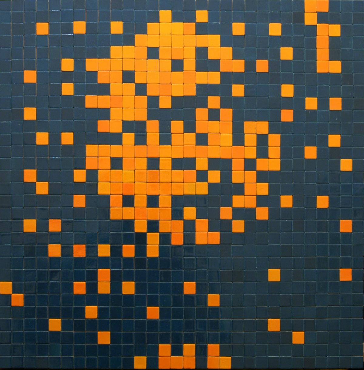 Ez az egyik első kép, amit sugároztak a Tv-ben 1926-ban. Azért 30 x 30-as, mivel az első kondenzátoros Tv-k ilyen felbontásúak voltak. 2 színből raktam ki, bináris számrendszert használtam, a számítógép „nyelvét”. Ahol van pixel ott narancssárga, ahol nincs, ott türkiz. Egy olyan képet akartam létrehozni, mely fotó alapú, de nem realisztikus.