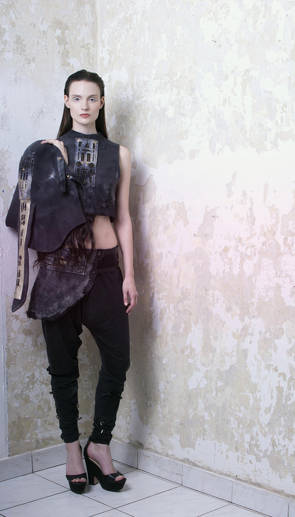A Noir Collection darabjait berlini épületek, hazai art deco házak és az 1927-es Metropolis című film ihlették. Az egyes ruhákban érvényesülő asszimetria, a keleti vonalvezetés formai megoldásai elemekre bontva mutatkoznak meg, a díszítő elemként használt minták önálló ékszer rétegként jelennek meg. Az anyagokban ezúttal is jelen van a gyapjú, a nemez és egyéb természetes anyagok, ezeket fémmel és bőrrel, valamint emberi hajjal ötvöztem.