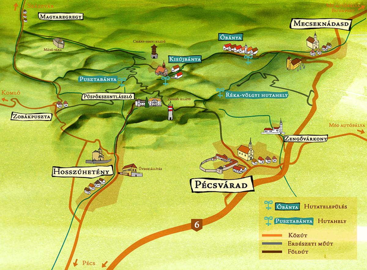 A kelet-mecseki üveghutákat bemutató, rajzos látványtérkép.