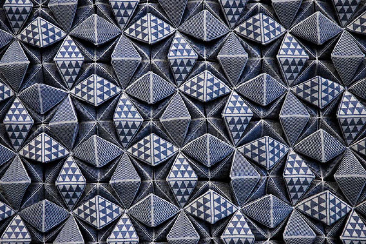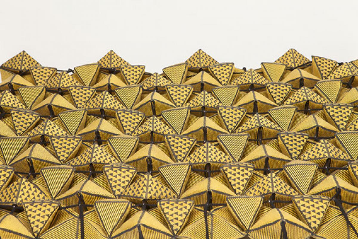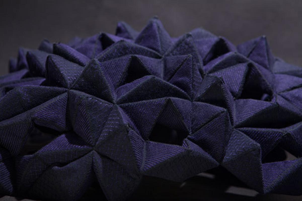 Funkciójában egy olyan szövet létrehozása volt a célom, ami megfelelő szintre csökkenti a zengőtéri zajt. A struktúra a sík szövetből hajtogatott térbeli geometrikus formák összekapcsolásával jön létre.