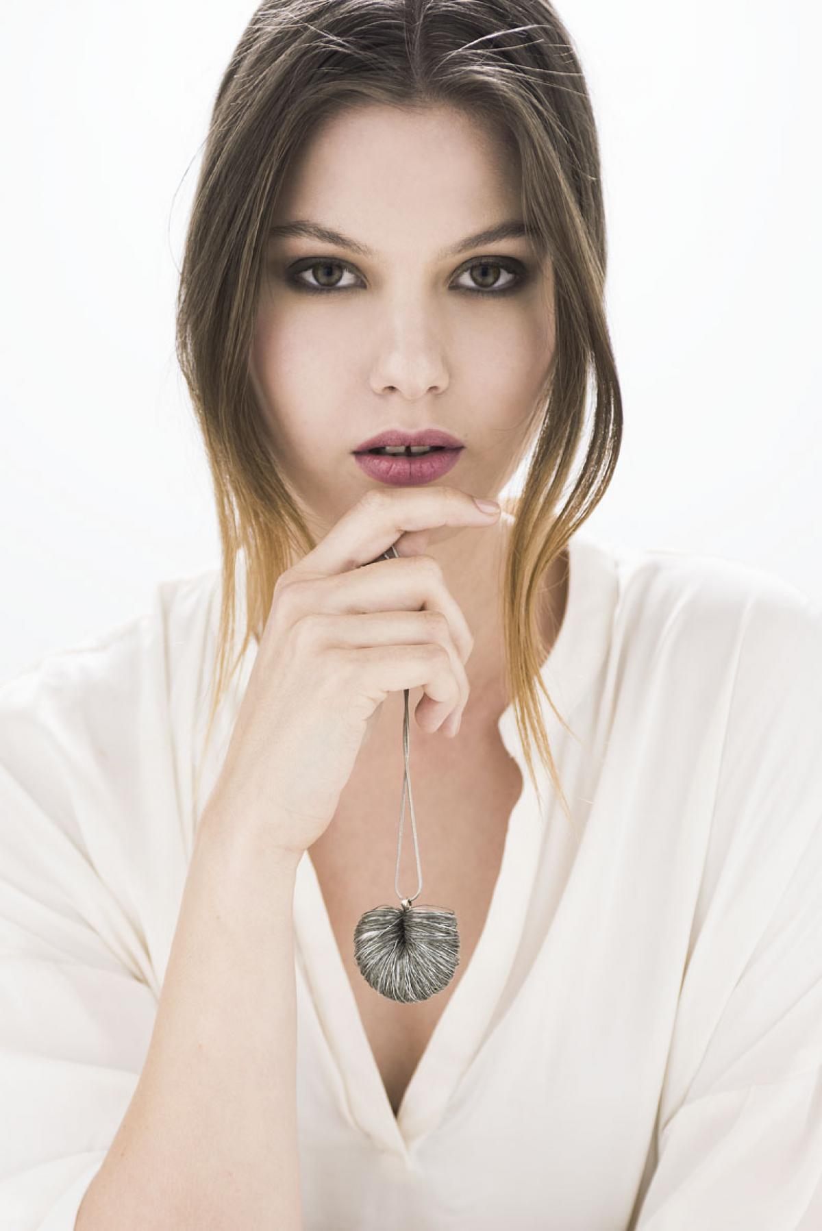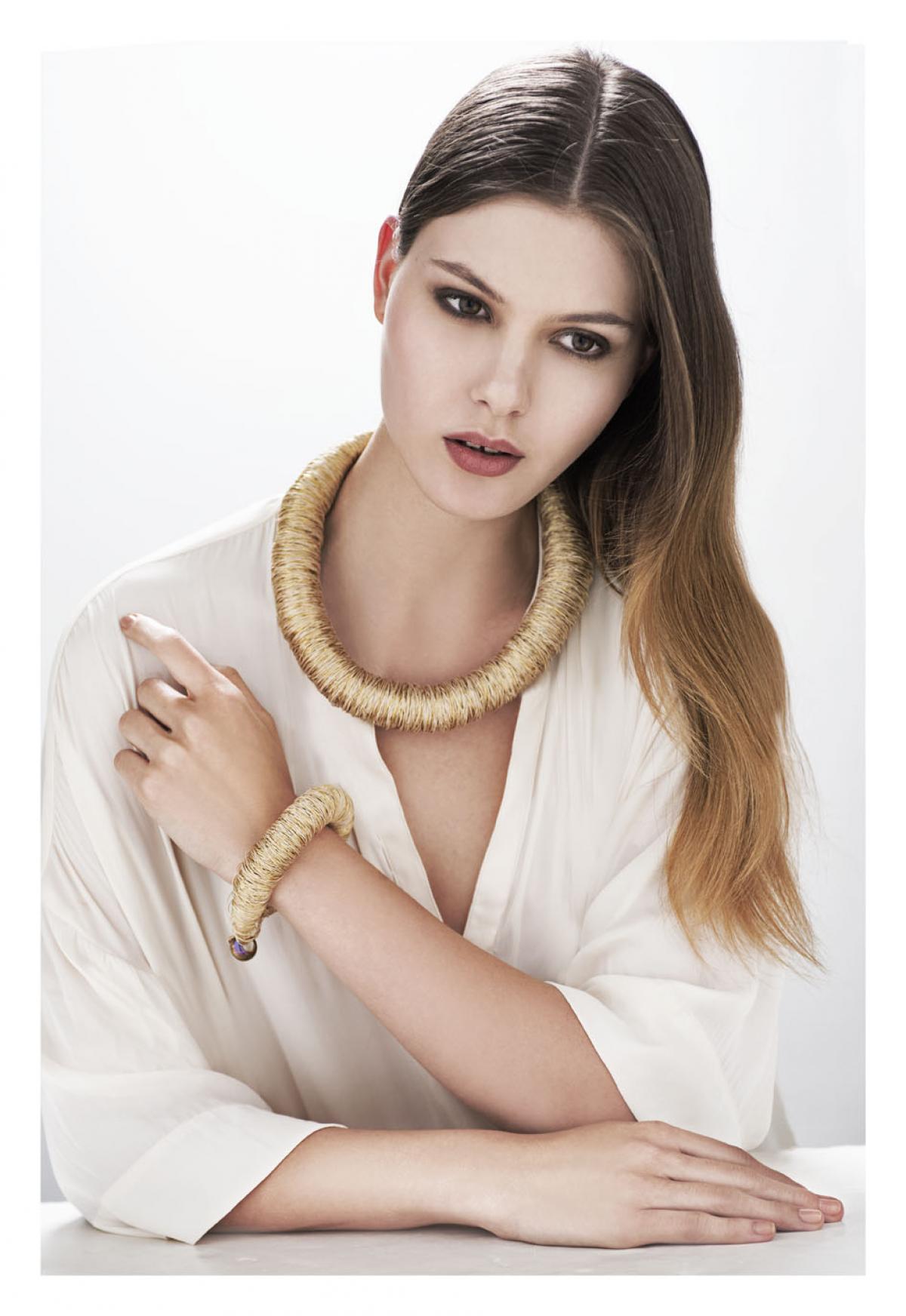 A kollekció egy könnyű, belül üreges struktúra variációiból áll, ami len fonalak és fém szálak összetekerése által jön létre. Ez az anyagkombináció adja az ékszerek különleges fényét és tartását.