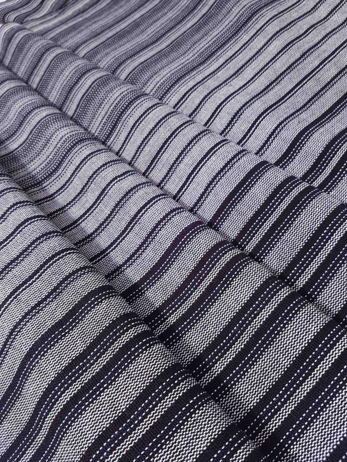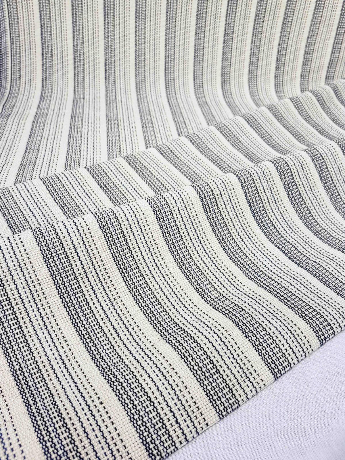 A három darabból álló lapfüggöny kollekciómat az op art művészeti irányzat inspirálta. A térbeliség eléréséhez a függőleges, oszlopszerű csíkozást választottam, amivel egyben egy optikai hullámzást értem el a szöveten. A felületén kialakult háromdimenziós hatás azért is megtévesztő, mivel a minta síkban van.