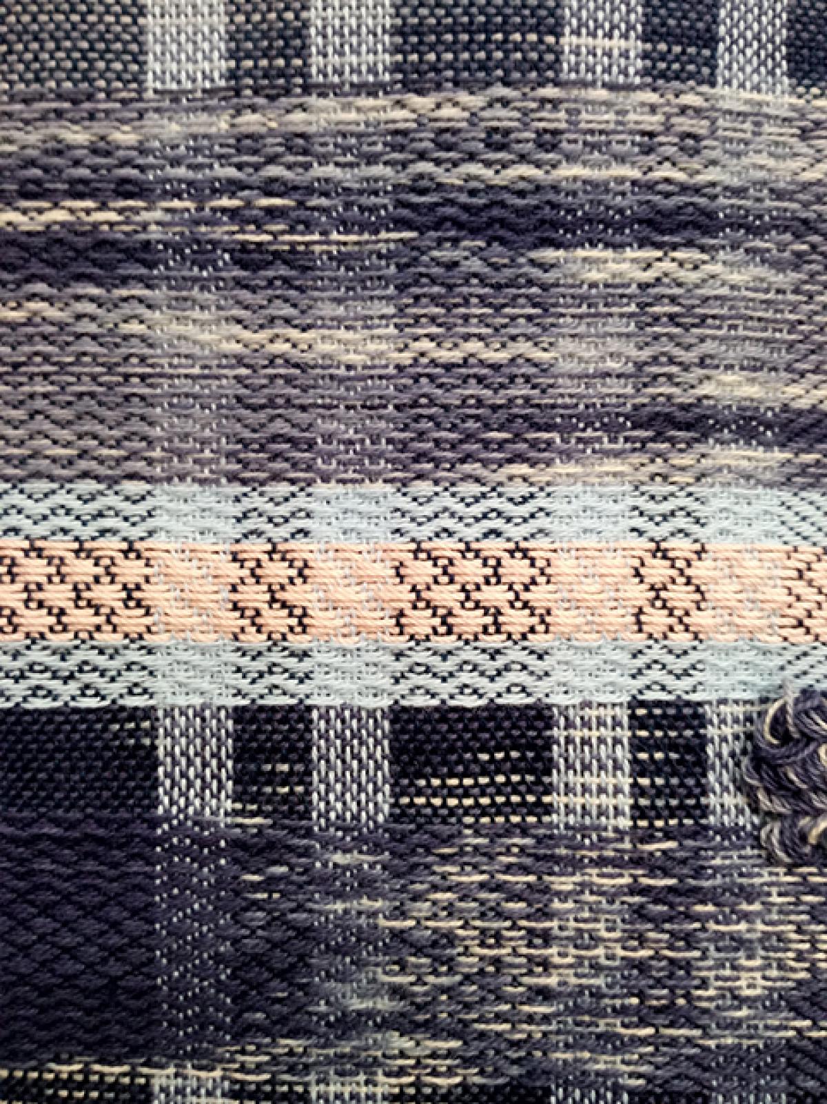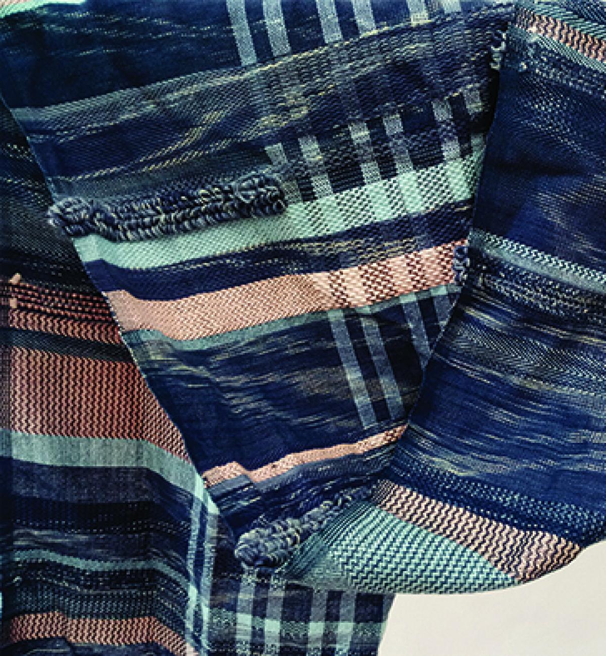 Kéziszövött ikat sál és mintaterv. Kiállítva a 2017-es Heimtextilen a Campus-negyedben.