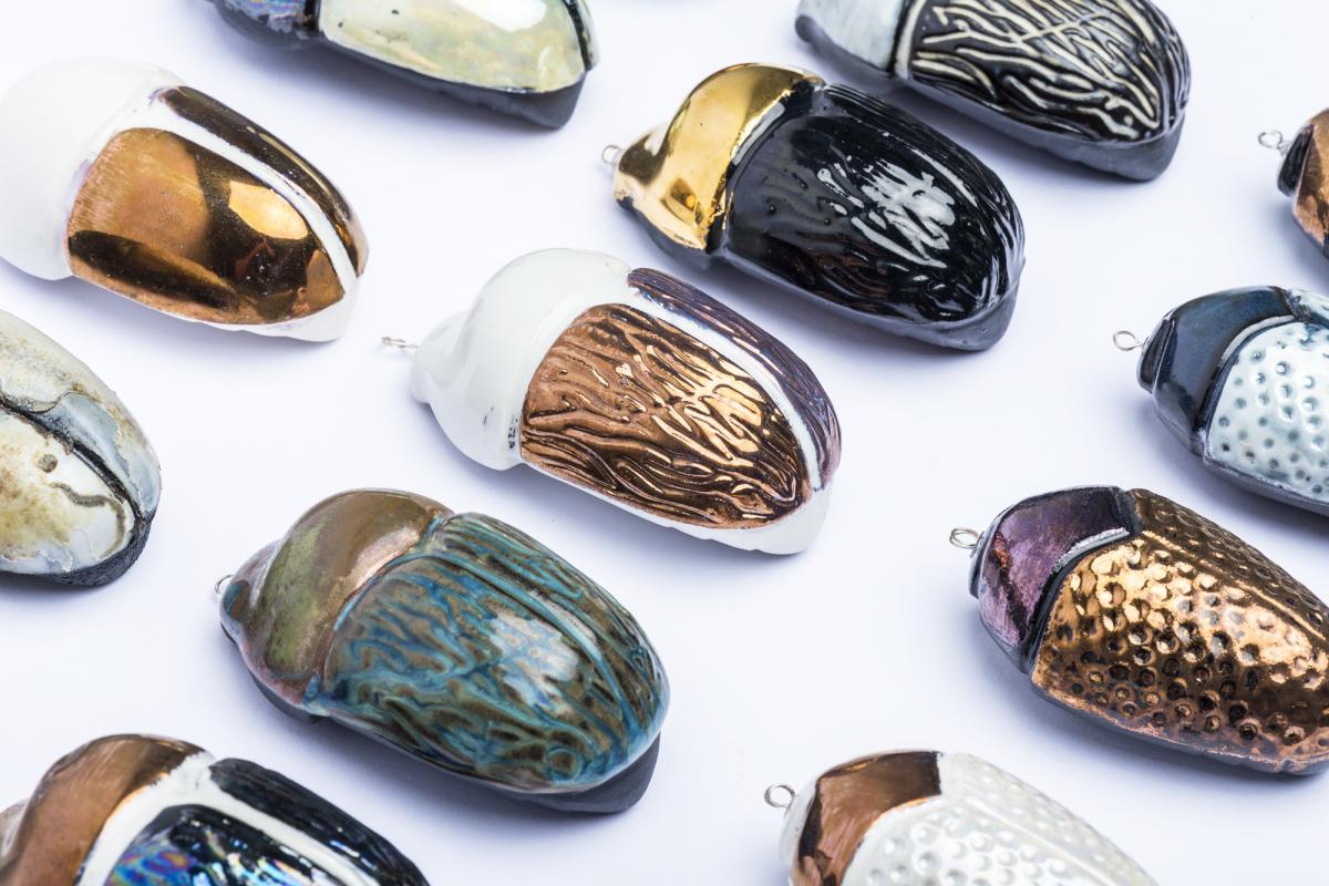 Gyűjtemény máz és lüszterpróbákból, ami a bogarak irizáló kitin páncéljára reflektál. Karácsonyfa díszítési szokásainkat kutatva olyan tárgycsoport létrehozása volt a célom, mely távolról színes díszekként működnek.