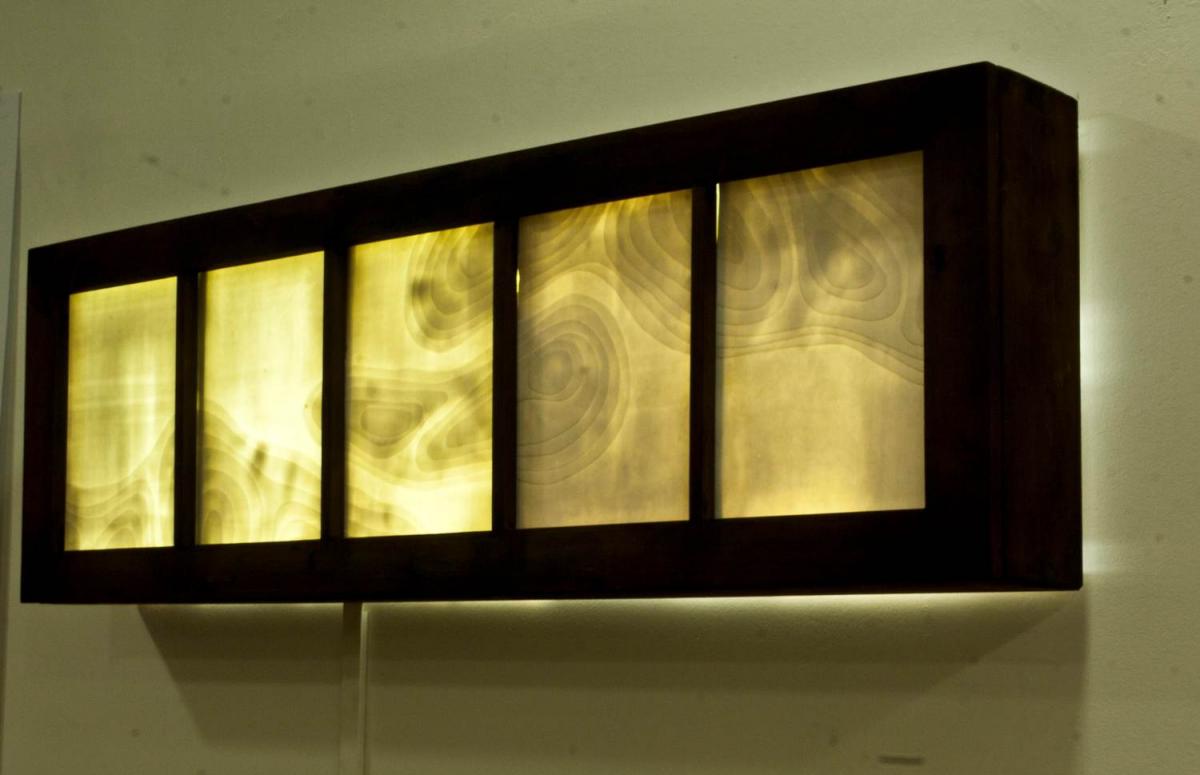 A falon lógó világítótest porcelán lapjai litofán technikával készültek. A porcelán fényáteresztőképességével játszottam, ahol a porcelán vékony ott áttetsző ahol vastagabb ott kevésbé. Inspirációmat a lila káposzta rétegei adták. The porcelain covers of this hanging lamp is based on lithophane technique, a game with translucency of the porcelain. I used this detail to show the porcelain’s uniqueness – where it is thin the area is translucent and where the porcelain is thick the area is not. The pattern of the porcelain was inspired by the layers of red cabbage.
