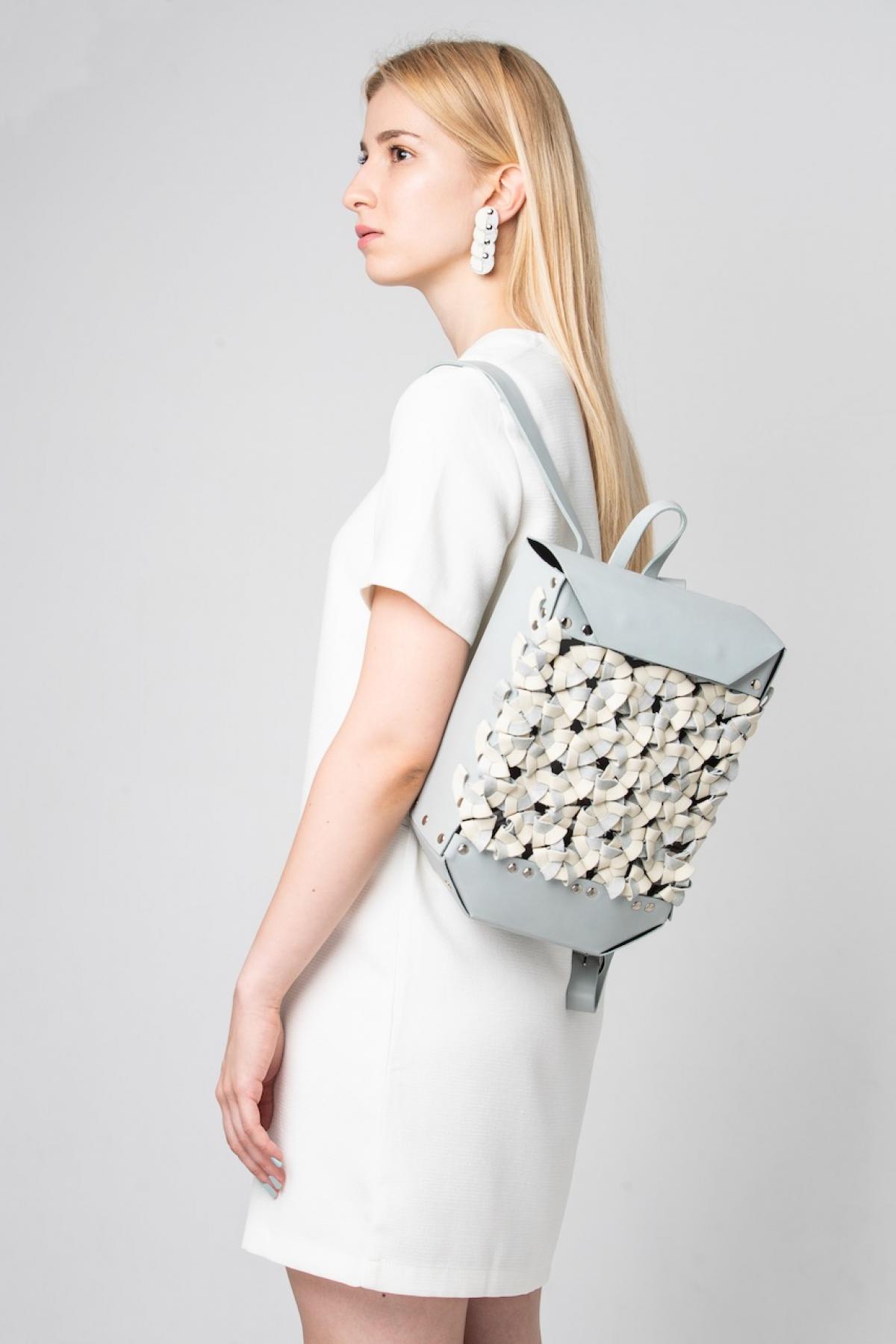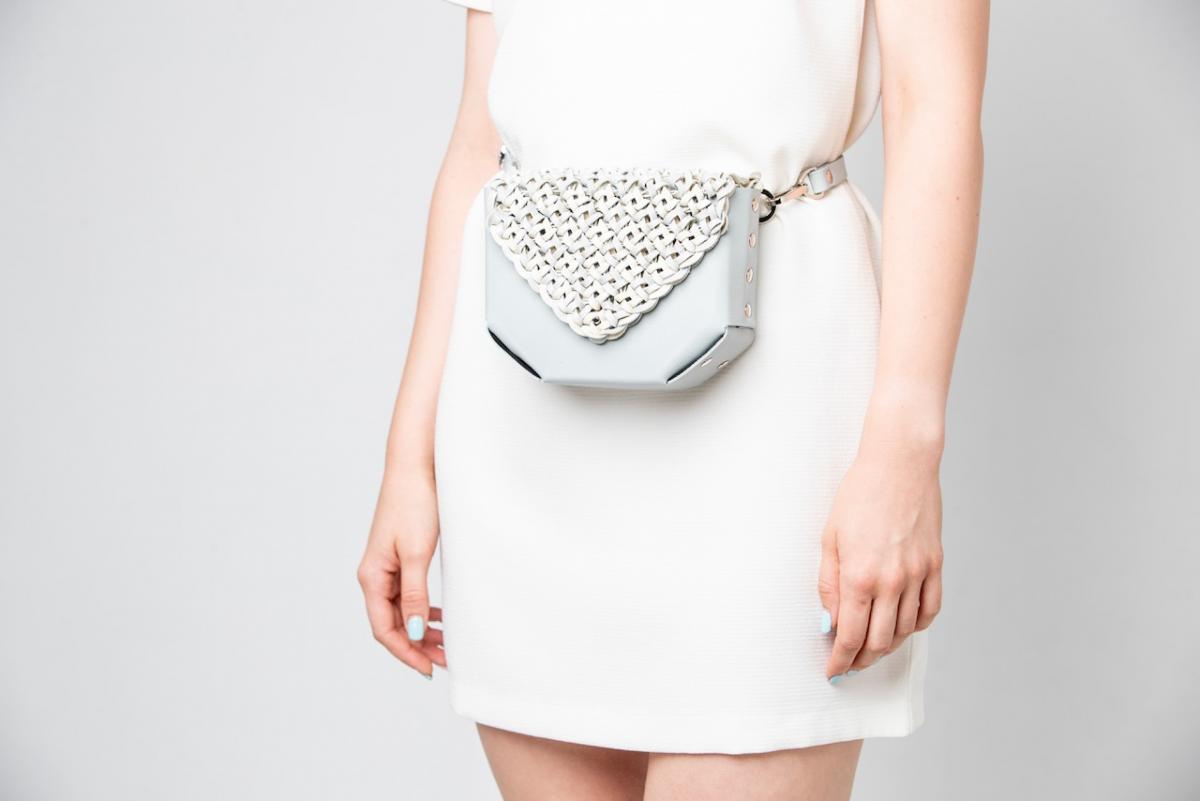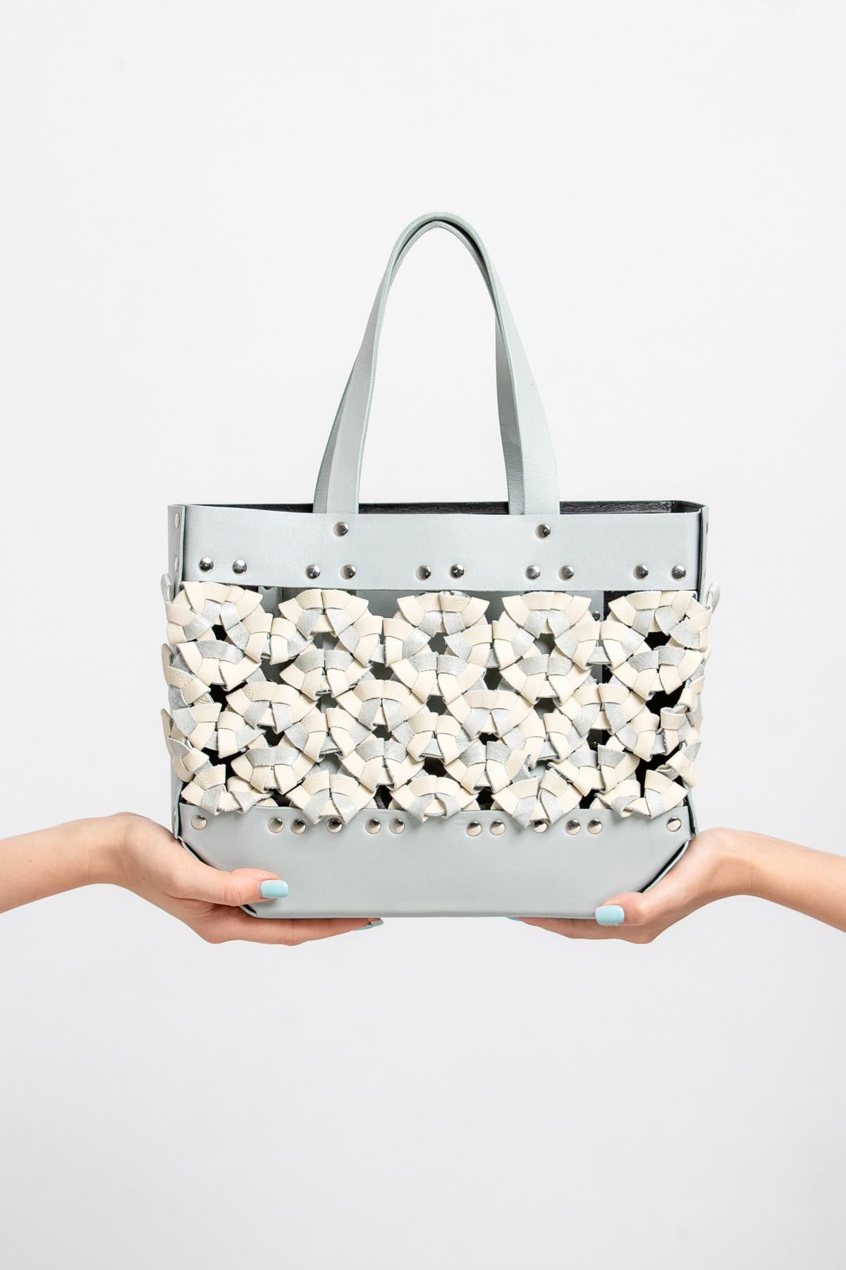 A táskán látható egyedi tervezésű fonott felület egy elemből épül fel.