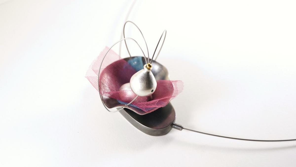 Oxidised silver (925) / emerald / 18ct gold / steel / tulle