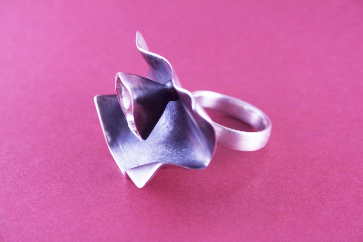 With film and graphic prequalification it is important for me that transitions from plane to space and tiny movements get the attention they deserve on the designed object. I've been doing studies on the lotus plant for several months. When designing this series of objects, I rearranged the natural and abstracted elements of this formal family so that these two worlds do not divide, but rather reinforce each other, while the viewer is outsmarted, creating a new system according to the function of the jewelery. According to Gilles Deleuze the past is not created after the present that had been, but at the same time ... That is why time is not inside us, but on the contrary: "time the intimacy in which we exist, move, live, and change". I materialized this time-theory while adjusting to the laws of silver and tulle.