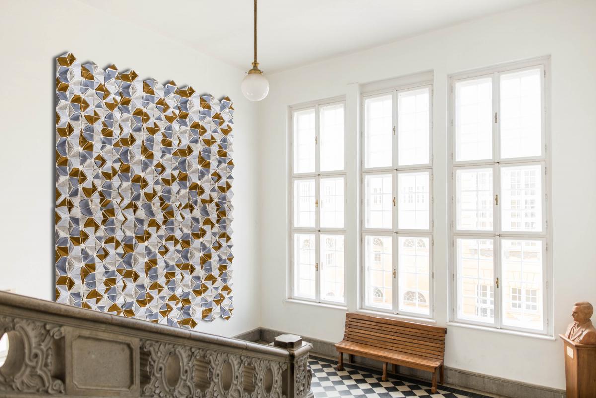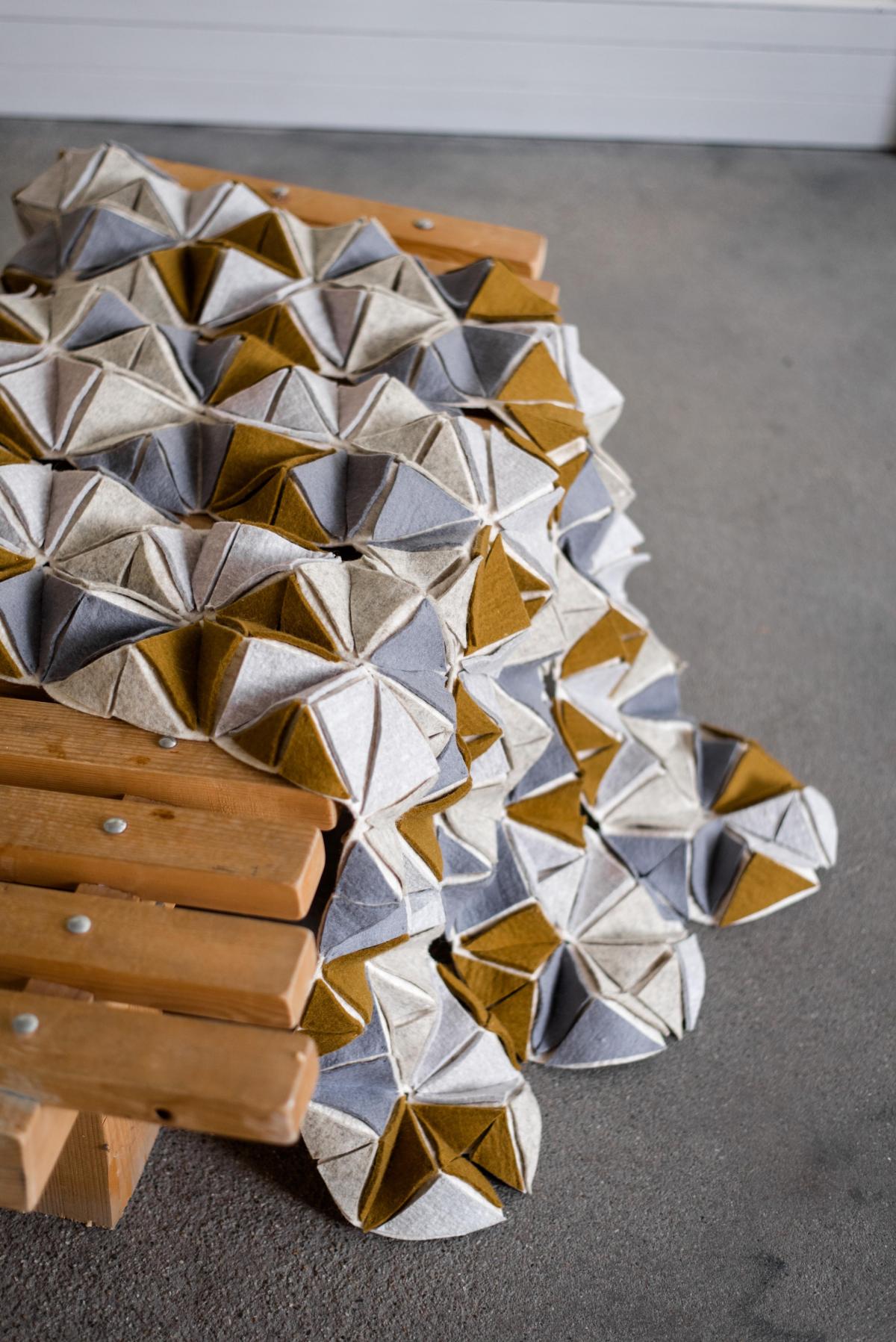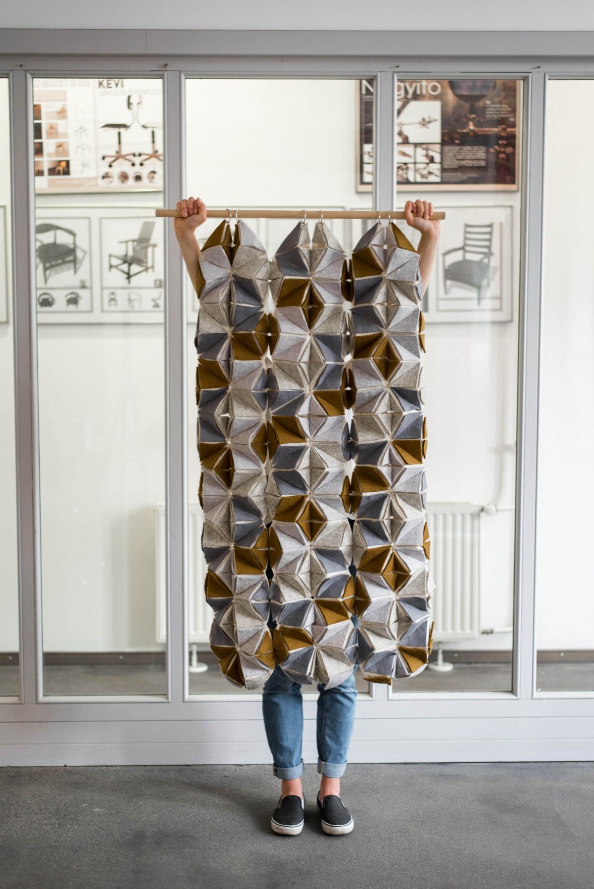 Diplomamunkám azért izgalmas, mert egy bármilyen irányba növelhető, alakítható és hajtható tárgy. A térbeli felület két rétegből áll össze, egy vékonyabb anyagra, erősebb, méretre vágott háromszögek vannak varrva, majd összehúzva és pár öltéssel rögzítve. Az alapanyag 100% gyapjúfilc, természetessége, jó hangelnyelő képessége és tömöttsége miatt alkalmas a struktúra kialakítására és megtartására. Összecsukott állapotában megkönnyíti a tárolást és a szállítást. A felület mintázásával végtelen variációs lehetőség áll rendelkezésre a fémesen csillogótól a matt természetes hatásig. Falra függesztve, de akár a térben elhelyezve paravánként is alkalmazható.