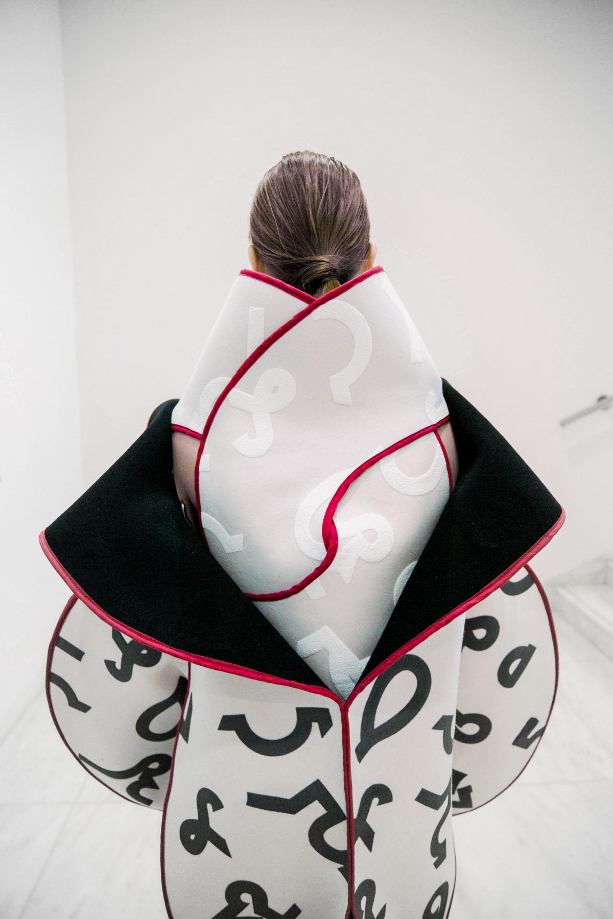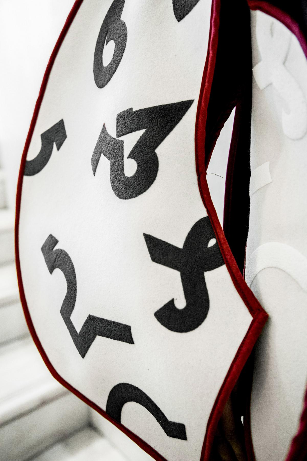 Valerie Jaudon festményét dogoztam fel mintaként, majd a grafikai terveim alapján olyan divattervezővel működtem együtt, akit ugyanez a festmény inspirált a ruha készítésénél. A forma és a minta szépen összeért egy objektben. A felület szitanyomással készült, hőre felpuffadó festékkel dolgoztam.
