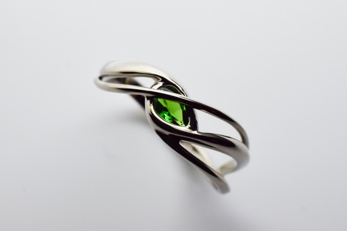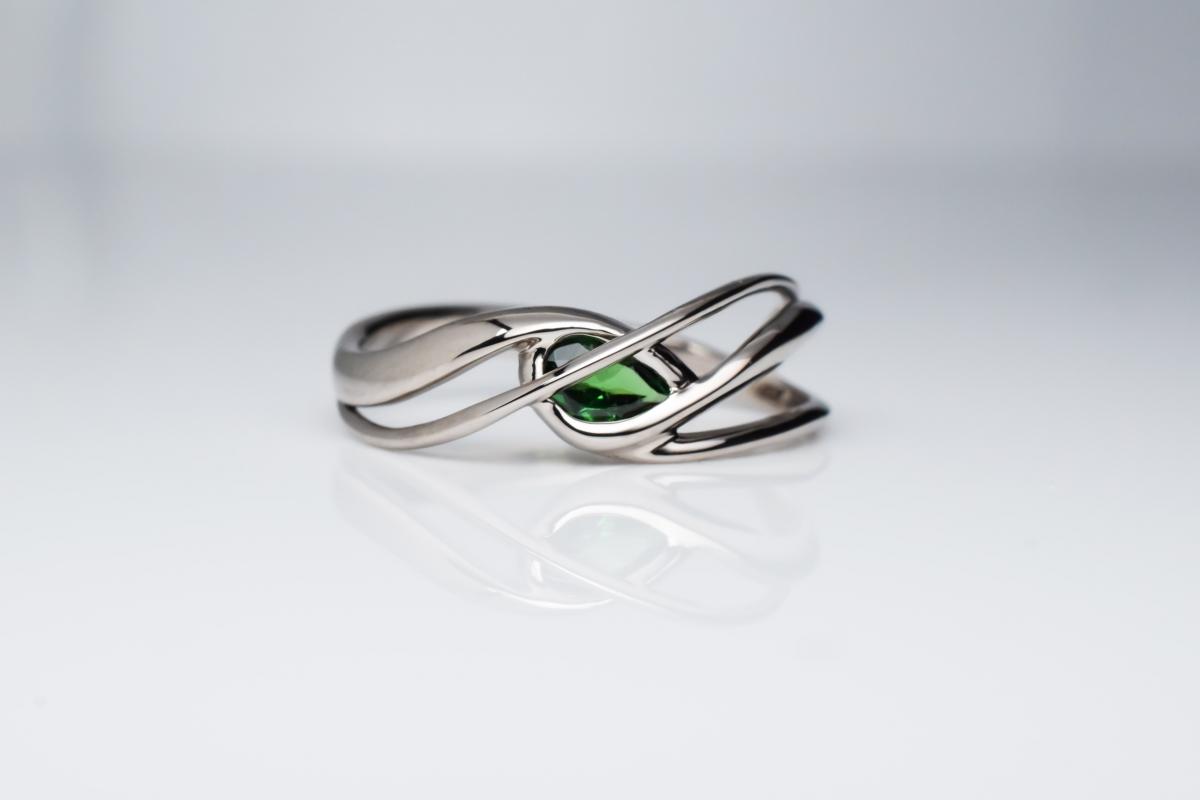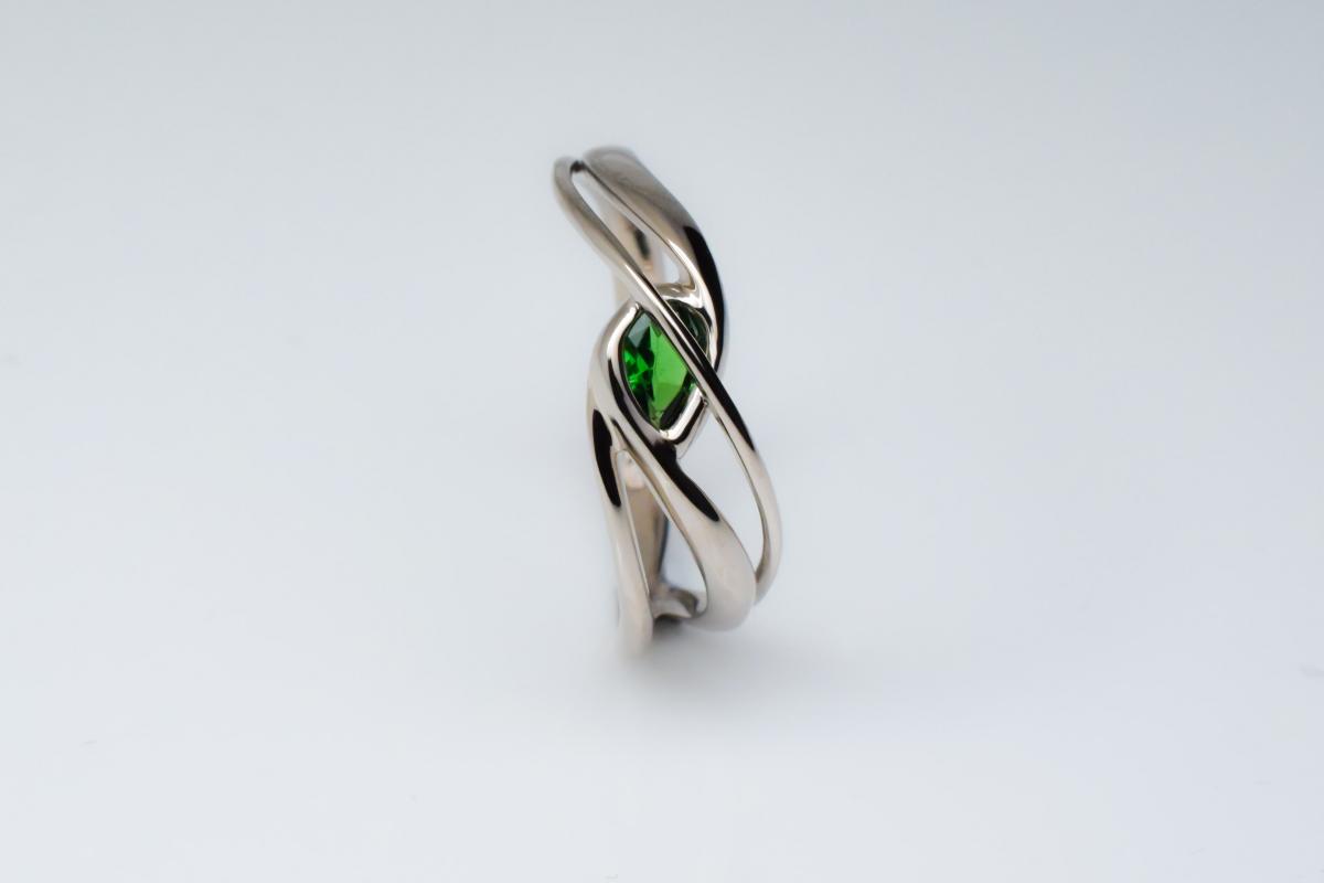 Ez a miniatűr szecessziós szobor rendesen megcsavar; végtelen hullámokon utazunk a palládiumos fehér arany lágy ívein, miközben le sem tudjuk venni szemünket a központban világító tsavorit ékkőről. Eljegyzési gyűrűként pont annyira szolíd mint amennyire egyedülálló.