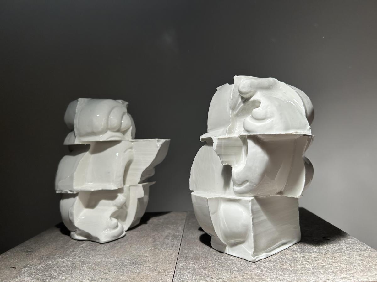 A régi találkozása az újjal. Porcelán plasztikáim magukon hordozzák a múlt lenyomatait, motívum világát, mindezt ötvözve a mai kor formavilágával. Minden egyes tárgyban fellelhető ennek a két korszaknak a találkozása, megerősítve ezeket a találkozásokat az éles határozott vonalakkal, hálós szerkezettel.