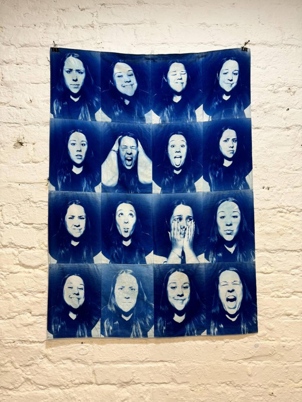 Cianotípiával készült textilkép, amin különböző érzelmi állapotok jelennek meg. Saját magamból kiindulva megmutatom, hogy mennyire sokféle arcom van, és ez még csak csekély töredéke annak amennyi érzelmet meglehet jeleníteni. A saját magam megmutatásának egy lépcsőfoka még csak ez a munka.