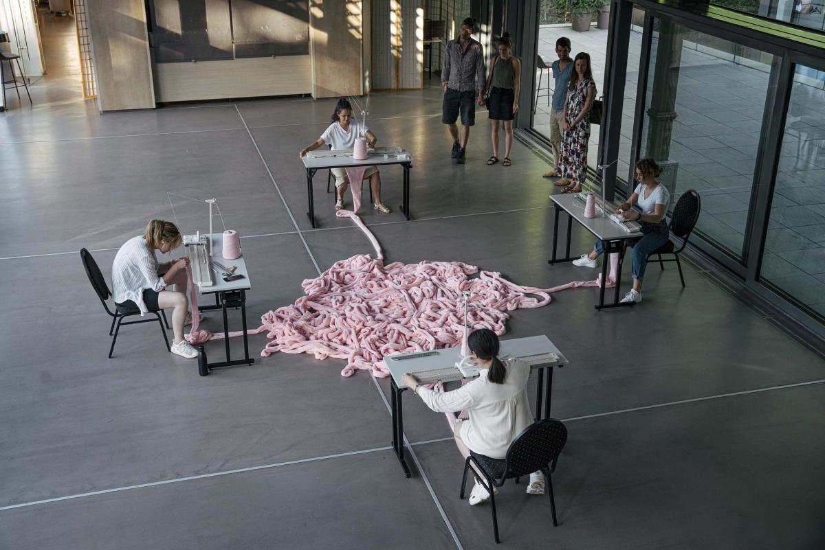 A hagyományosan női kézimunkaként számon tartott, funkcióelvű tevékenység a folyamat során átlényegült, hiszen funkciójától megfosztva, egy egész napos, monoton, fárasztó cselekvést láthattak a nézők, melynek eredményeképpen rengeteg méter kötött kelmével hálóztuk be a helyszínt.