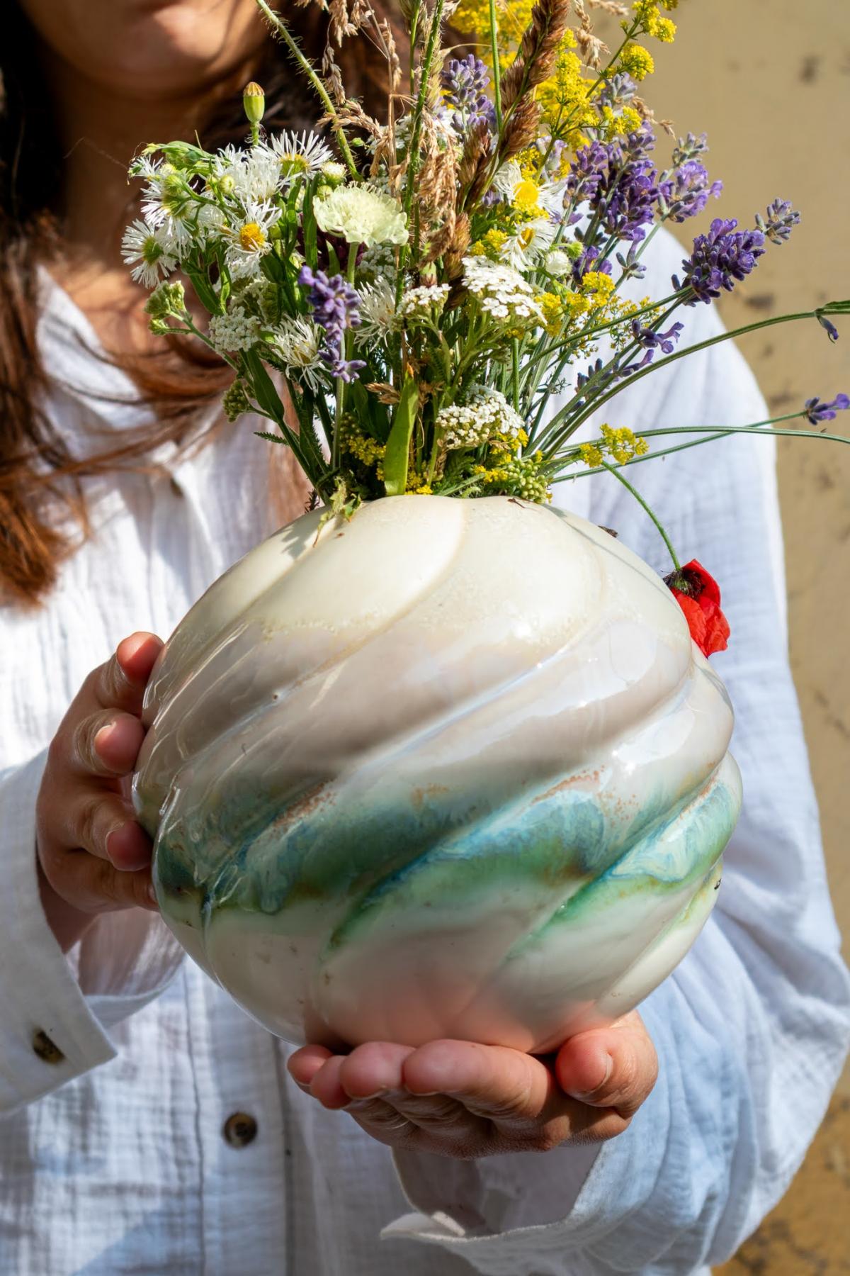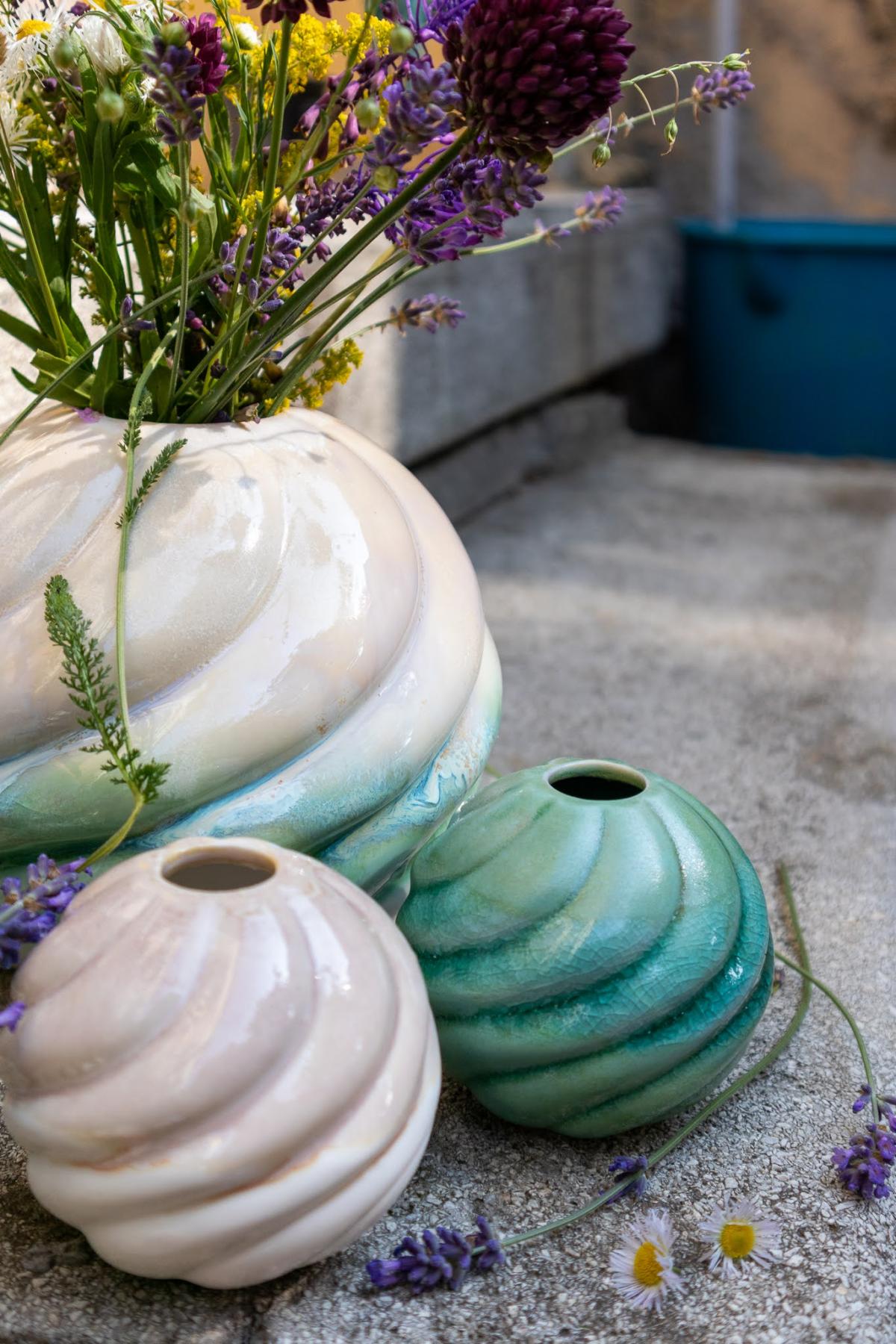 Fibonacci porcelánsorozat a természetben rejlő rend és harmónia matematikai leképezése. Középpontjában a logaritmikus spirál áll – egy ősi, a természet számos jelenségében visszatérő struktúra. A logaritmikus spirál a Fibonacci-számsor térben kibontakozó alakja, amely az aranymetszéshez kapcsolódó természetes arányokat és egyensúlyt tükrözi. Ezért nem csupán díszítő elem, hanem a tervezés alapját képezi, amely harmóniát teremt a formákban. A spirál a teljességet és a folytonosságot idézi meg. A formák az aranymetszés törvényszerűségeire épülnek, így a kompozícióban a természet matematikai ritmusa válik érzékelhetővé. A természetet leíró matematika és az érzékeny formaalakítás találkozása a porcelánban időtálló alakot ölt. A sorozat személyes reflexióként is értelmezhető: a spirál a művész számára a belső fejlődés, az elmélyülés és a világ rendjéhez való kapcsolódás szimbóluma. A máz és a színvilág a mészkő természetes, meleg árnyalatait idézi meg: krém, halvány bézs és törtfehér tónusokban. A mészkő jelentős része az ősi élőlények meszes vázából keletkezett az évmilliók során, melyek szerkezete a Fibonacciszámsort követi. Ennek köszönhetően magába zárja a természet csodáját, amely a porcelán felületén is megjelenik. Feltűnik még a kék szín is, amely a tenger mélységeire és az ősi élővilág vízi eredetére utal, finom kontrasztot alkotva a mészkő árnyalataival. A logaritmikus spirál lenyomatát 3D modellező program és nyomtatás alakítja át statikus, kézzelfogható objektummá. A modell parametrikus, de minden esetben a Fibonacci-számsor matematikájára épül, így őrzi meg a természetes arányok rendszerét a formaalkotás során. A tárgyak félporcelán anyagból öntéses tech-nikával készültek.